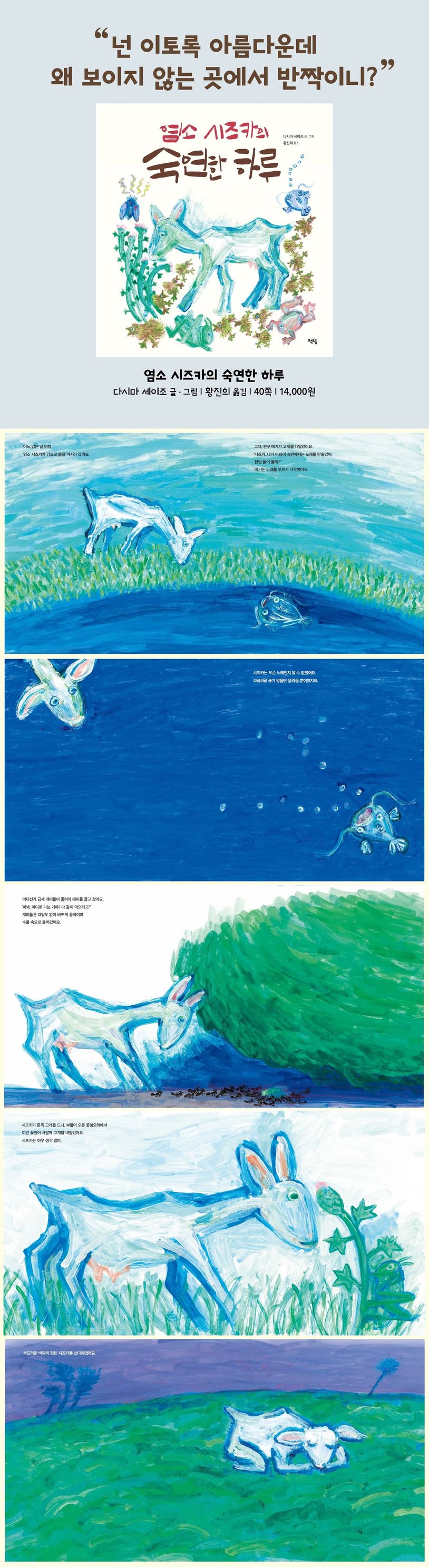 다시마 세이조 작가는 자연에서 평화롭게 살아가는 시즈카에게 아름답고 경이로운 하루를 선물합니다. 파랑과 초록의 자연의 생명력이 가득한 화면은 자유롭고 생동감이 넘치며, 간결하고 정감 있는 글에 시즈카의 성장이 따뜻하게 담겼습니다. 생명의 순환과 삶의 소중함을 생각하며, 오늘을 씩씩하게 살아가는 모두를 위로하는 그림책입니다.
