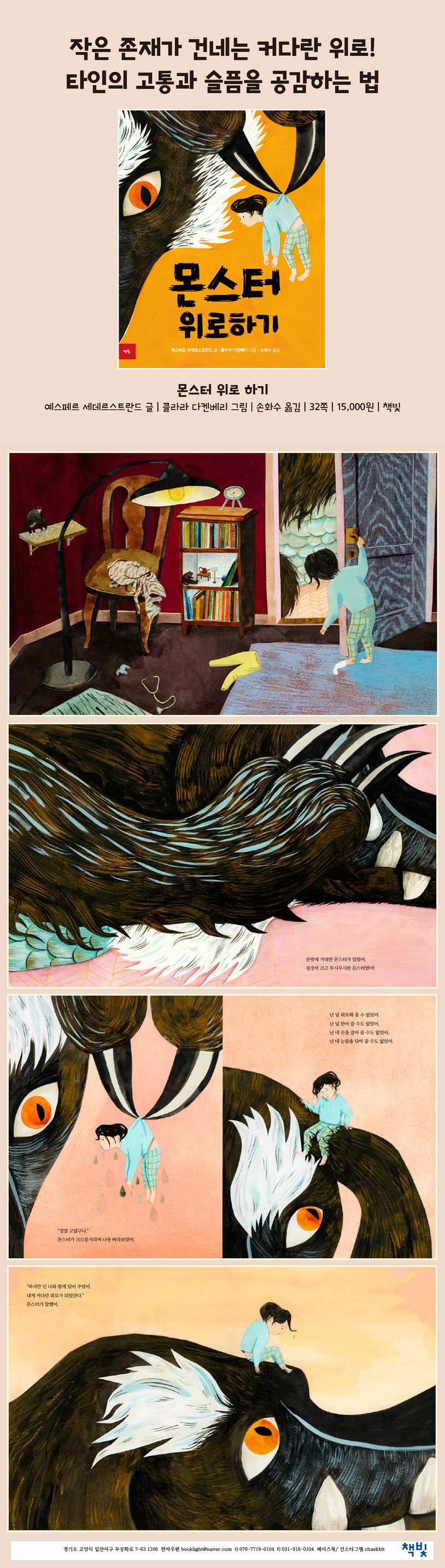 크르릉 크르르르릉! 아침에 눈을 뜨니 이상한 소리가 들립니다. 문밖을 살펴보니 거대한 몬스터가 있습니다. 뾰족한 발톱, 커다란 비늘, 날카로운 이빨을 가진 무시무시한 몬스터를 보고 아이가 먼저 알아차리는 것은 몬스터가 슬프다는 것입니다. 아이는 얼른 몬스터를 안아주려고 하지만, 팔이 너무 짧아서 안아줄 수 없고, 몬스터의 손을 잡아주려고 하지만, 아이의 작은 손은 커다란 몬스터의 손에 파묻혀버립니다. 몬스터에게 아무것도 해줄 수 없자 아이는 고개를 숙이고, 몬스터는 큰 소리로 울부짖기 시작합니다. 과연 아이는 어떻게 몬스터를 위로해 줄 수 있을까요?