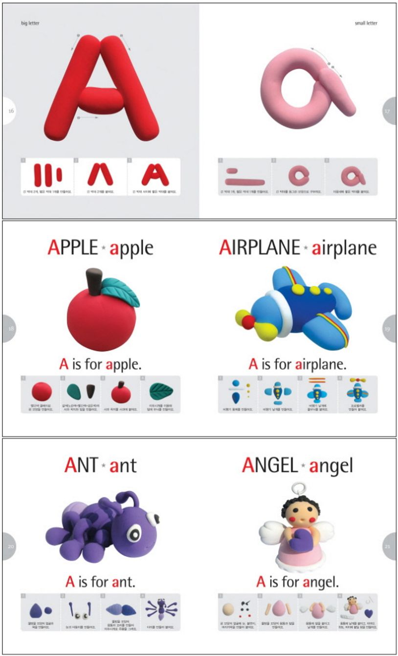 『클레이로 조물조물 알파벳 놀이터』는 유아를 대상으로 한 영어 교재입니다. 클레이 점토를 활용해 알파벳의 대문자와 소문자, 단어를 만들어 보면서 영어에 쉽고 친근하게 다가갈 수 있습니다. 본문의 내용과 삽화 역시 클레이 점토로 제작하여 예시를 보여줌과 동시에 아이들이 클레이 점토에 흥미를 느낄 수 있도록 합니다.