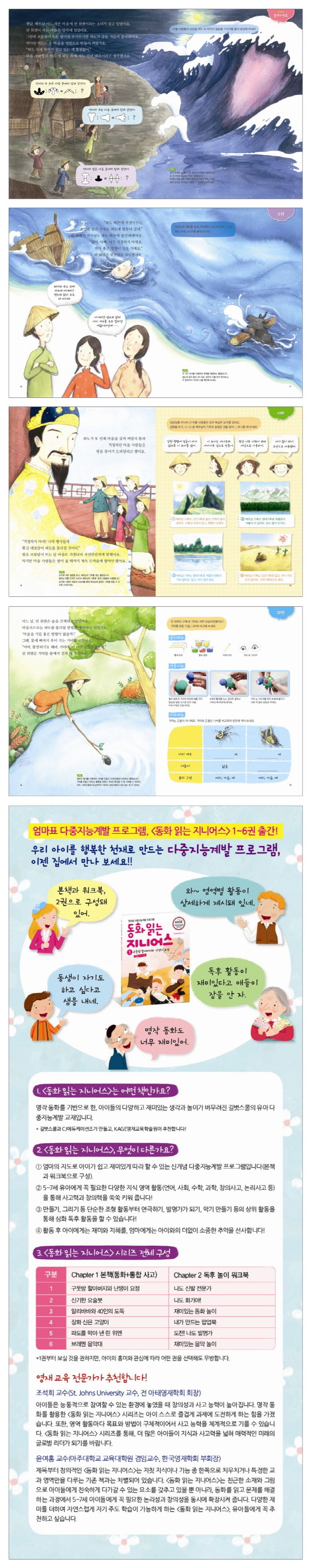 는기존도서에서볼수없었던다중지능계발동화이기에참신했습니다.또한아이의논리사고력을키우는도구로새로운형식의이야기가아니라,기존에많이듣고알고있는동화와접목시켜아이가받아들이기에부담스러워하지않아서좋았습니다.전체적으로내용은아이와함께진행하는데무리가없었으며,그림도예뻐서저희딸은‘장화신은고양이’에푹빠져지냈답니다.또한한장한장진행할수록본문을잘읽었는지확인하고,새로운사고를할수있는활동영역으로구성되었기에아이뿐만아니라엄마인저도다음엔어떤내용이나올지궁금하고기대되더군요.그리고엄마와함께동화를읽으면서활동자료를만들수있는워크북도있기에더욱더아이가재미있어했고,한번에모든걸다끝내려고해서오히려곤란했어요.
