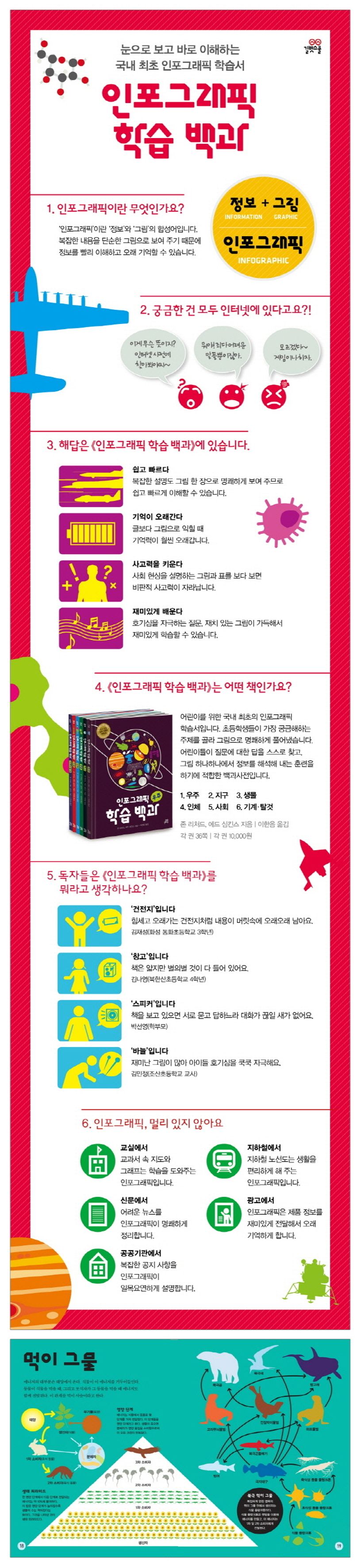 《인포그래픽학습백과》는어린이들의눈높이에꼭맞춘합리적인백과사전입니다.어린이들이알아야할정보들을핵심키워드중심으로구성하고,복잡한정보들을단순한그림으로뚜렷하게보여줍니다.정보의홍수속에서길잃을염려없이,쉽고빠르고정확하게이해할수있습니다.