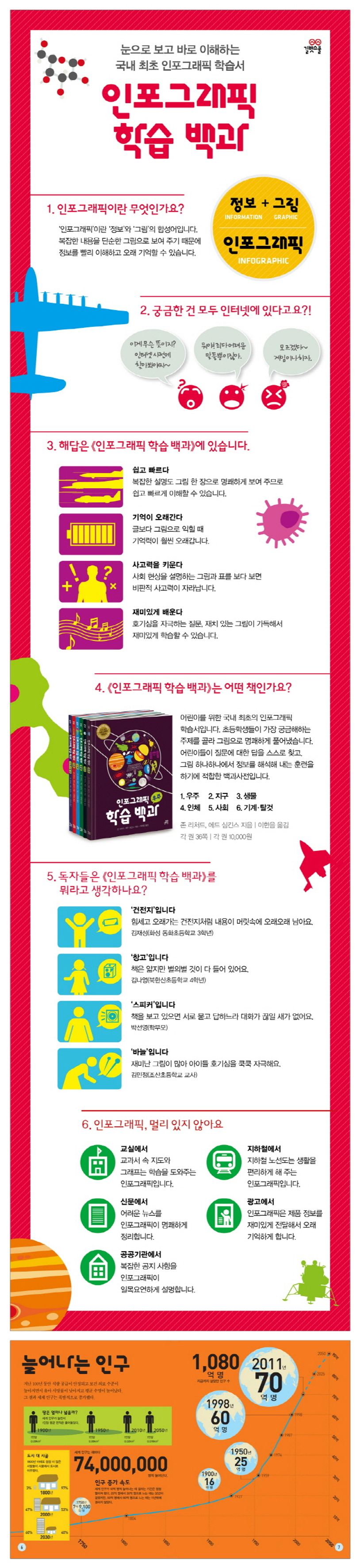 《인포그래픽학습백과》는어린이들의눈높이에꼭맞춘합리적인백과사전입니다.어린이들이알아야할정보들을핵심키워드중심으로구성하고,복잡한정보들을단순한그림으로뚜렷하게보여줍니다.정보의홍수속에서길잃을염려없이,쉽고빠르고정확하게이해할수있습니다.