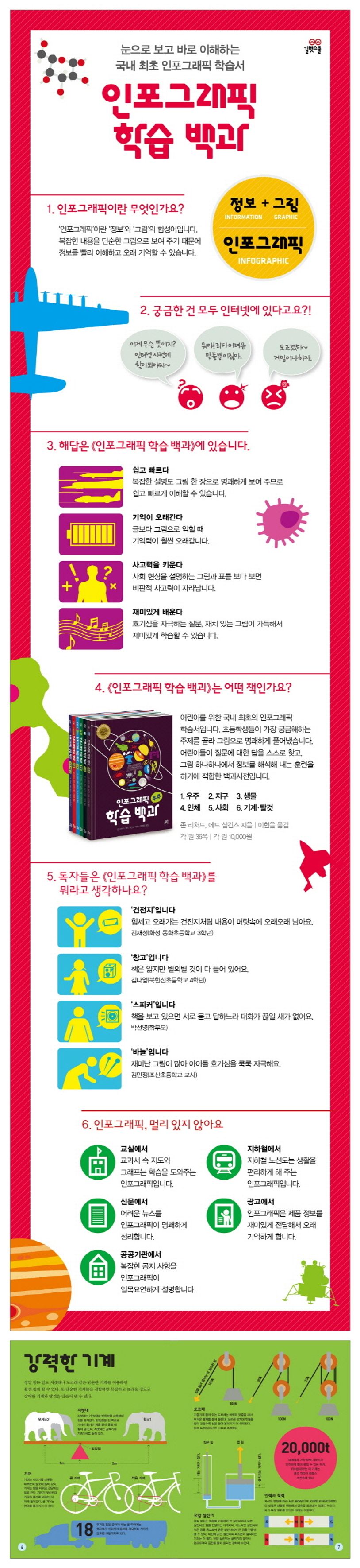 인포그래픽은많은양의정보를그림하나로효과적으로전달하는새로운커뮤니케이션방식입니다.《인포그래픽학습백과》는국내최초로소개되는인포그래픽학습서로서,초등학생들이가장궁금해하는6가지주제(우주,지구,생물,인체,사회,기계·탈것)를그림으로명쾌하게풀어냈습니다.