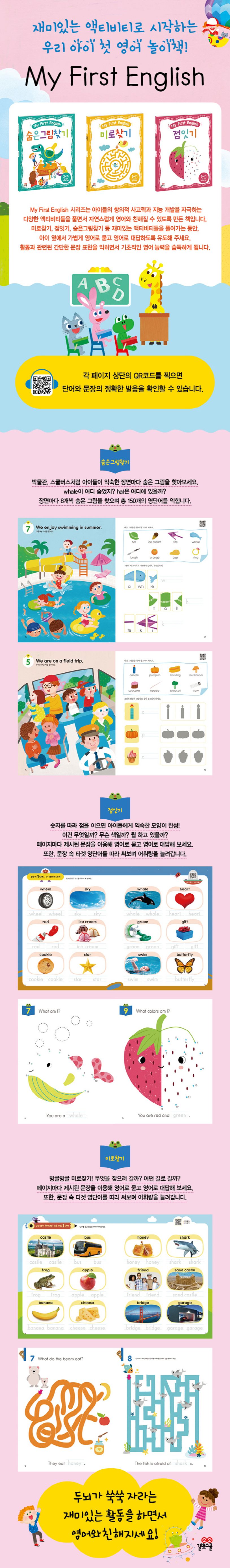 재미있는액티비티로시작하는우리아이첫영어놀이책!본격적으로영어공부를시작하기전,두뇌가쑥쑥자라는재미있는활동을하면서영어와친해져요!유아기의아이들에게는자연스러운영어환경을만들어주어영어에친숙해지는과정이필요합니다.영어와단절되어있다가나이가되었다고공부를시켜보려는갑작스러운접근보다는놀이로써영어에호기심을키워주고재미있고즐거운것이라는인식을심어주는것이중요합니다.MyFirstEnglish시리즈는아이들의창의적사고력과지능개발을자극하는다양한액티비티들을풀면서자연스럽게영어와친해질수있도록만든책입니다.점잇기편은1에서100까지점점커지는숫자를세면서그림을완성하고활동과관련된간단한문장표현을익히다보면기초적인영어능력을습득하게됩니다.아이가즐겁게액티비티들을풀어가는동안,아이옆에서가볍게영어로말을걸고영어로대답하도록유도해주세요.1.놀이활동으로자연스럽게기초영어습득!일관성있는그림톤과반복적인활동으로인지효과를높이고,활동을하고나서간단한문장표현을익히면서영어에자연스럽게접근할수있습니다.2.다양한점잇기활동이가득!1에서100까지점을이어그림을완성하면서자연스럽게수개념을익히고스스로생각하는힘을기를수있습니다.3.BARRON'S의MyFirstActivityBook시리즈한국어판미국의유명어학전문출판사에서만든MyFirstActivityBook시리즈에이시기의아이들에게필요한영단어와표현학습을함께담았습니다.4.들으면서학습할수있는QR코드음원수록!각페이지의QR코드를찍으면단어와문장의정확한발음을확인할수있습니다.