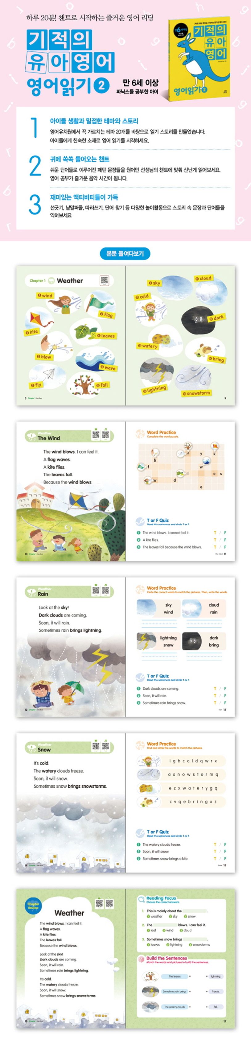 출판사서평하루20분!챈트로시작하는즐거운영어리딩![기적의유아영어-영어읽기]은전3권으로구성된읽기연습서입니다.아이들의생활과밀접한날씨,계절,친구,재미있는놀이등과같은주제를담고있습니다.각문장들은읽기쉬운구조의반복적인패턴문장으로이루어져있습니다.이야기의주제를충분히전달하는삽화를제공하고,챈트를통해노래를부르듯이반복해서따라읽으며단어와문장을익힐수있습니다.★이수준의아이들에게는쉬운영어지문을반복해서많이읽는것이중요하기때문에1-3권의단어와문장...하루20분!챈트로시작하는즐거운영어리딩![기적의유아영어-영어읽기]은전3권으로구성된읽기연습서입니다.아이들의생활과밀접한날씨,계절,친구,재미있는놀이등과같은주제를담고있습니다.각문장들은읽기쉬운구조의반복적인패턴문장으로이루어져있습니다.이야기의주제를충분히전달하는삽화를제공하고,챈트를통해노래를부르듯이반복해서따라읽으며단어와문장을익힐수있습니다.★이수준의아이들에게는쉬운영어지문을반복해서많이읽는것이중요하기때문에1-3권의단어와문장난이도는동일합니다.?이책의특징★아이들생활과밀접한테마와스토리영어유치원에서꼭가르치는테마20개를바탕으로읽기스토리를만들었습니다.아이들에게친숙한소재로영어읽기를시작하세요.★귀에쏙쏙들어오는챈트쉬운단어로이루어진패턴문장을원어민선생님의챈트에맞춰신나게읽어보세요.영어공부가즐거운음악시간이됩니다.★따라부르기쉬운경쾌한멜로디!선긋기,낱말퍼즐,따라쓰기,단어찾기등다양한놀이활동으로스토리속문장과단어를익혀보세요.?[기적의유아영어]시리즈특징1.영어습득의적기인3~7세를위한책유아기는영어를'공부'하기이전에영어에흥미를붙이고영어와친해져야하는시기예요.[기적의유아영어]는아이가재미있는액티비티들을경험하며영어에서'재미'를발견하고자연스럽게영어에친해지게합니다.2.재미있는영어워크북색칠하기,선긋기,오려붙이기,따라쓰기등유아가특히좋아하는액티비티들로구성되어있습니다.유아의눈높이에맞춰개발한액티비티들로,아이들이교재에쉽게흥미를보이고적극적으로참여할수있게됩니다.3.홈스쿨링하기좋은구성아이스스로참여하고해결할수있는단순하고직관적인활동들로이루어져있습니다.또한페이지하단에자세한지도가이드를제공하고있어영어를잘하지못하는부모라도누구나쉽게학습을도울수있습니다.4.꼭필요한학습영역을단계별로제시유아의연령및인지발달에맞춰유아기에꼭필요한영어노출과학습이이루어지도록영어교육전문가들이설계한프로그램입니다.[기적의유아영어]시리즈가제시하는단계별학습으로유아기영어를완성해보세요.