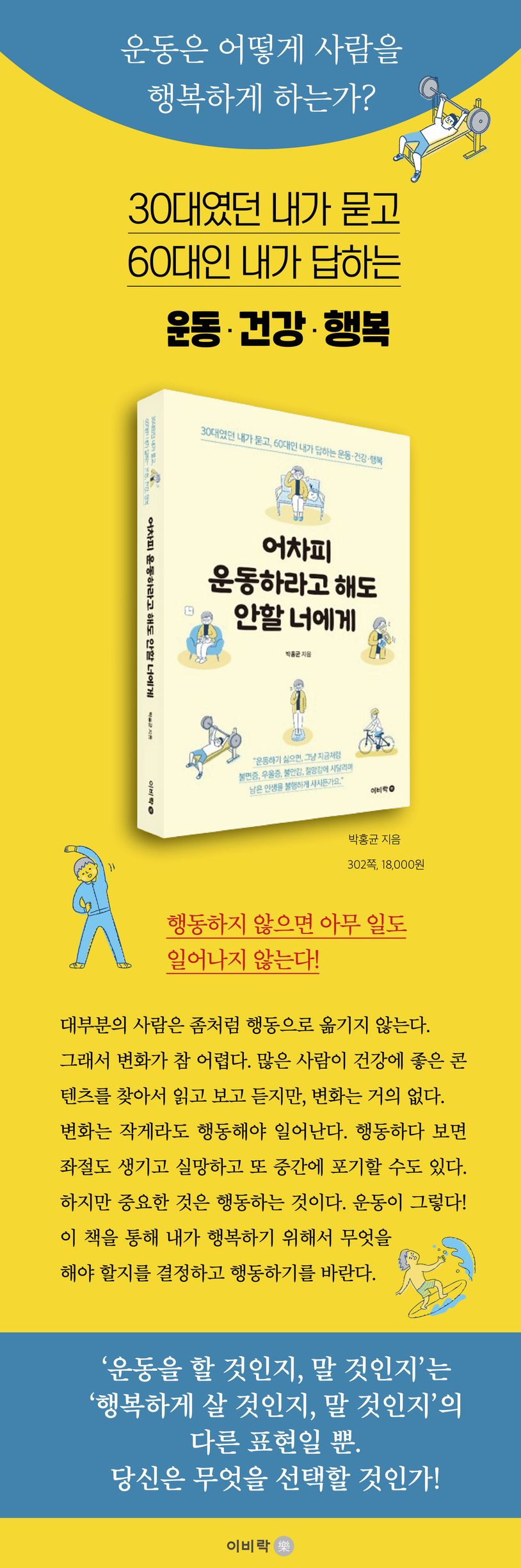 누구나 젊은 시절에는 건강하다. 또한 건강할 때는 건강의 소중함을 잘 모른 채 다른 사람은 몰라도 자기는 늙고 병들지 않을 거라고 자만하기 일쑤이다. 저자는 젊었을 때 누군가가 자신에게 운동하라는 이야기와 함께, 왜 운동해야 하는지, 그리고 운동이 습관만 되면 고통스럽지 않다고 이야기해 준 사람이 있었다면, 아마도 인생은 완전히 달라졌을 것이라며 운동하면 왜 행복한지를 경험과 논리로 흥미롭게 전하고 있다.