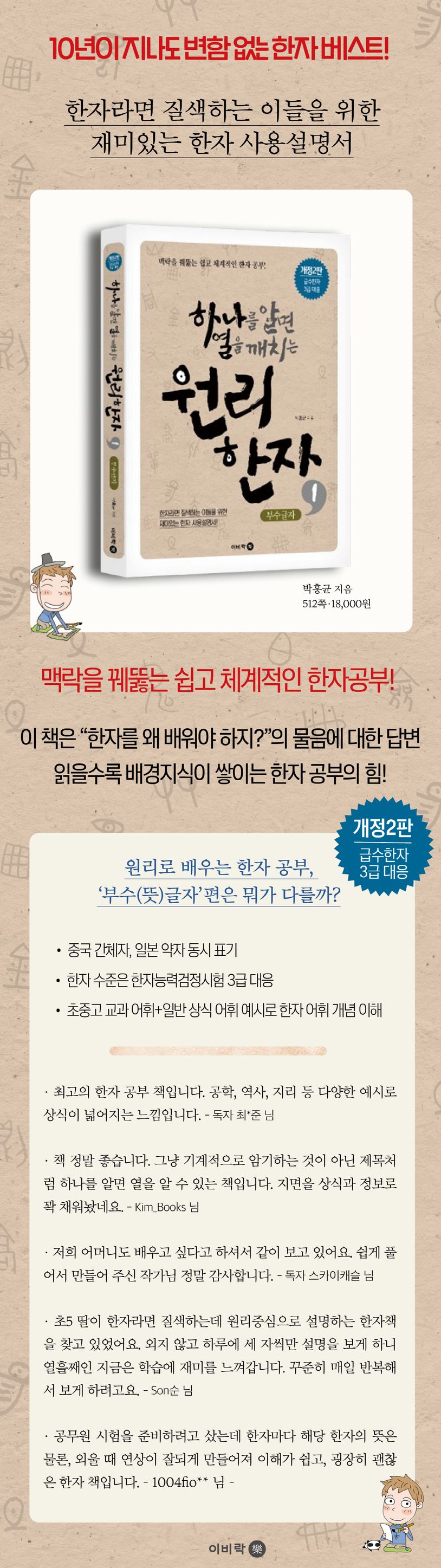 “한자 공부는 꼭 해야 한다”는 말에, 듣는 이들의 공통된 반응은 “한자를 왜 배워야 하지?”라는 것입니다. 이 책은 그 물음에 대한 성실한 답변이 되고자 하는 바람으로 만들었습니다. 보통 한자를 배우는 목적을 급수 따기, 승진, 입사 시험을 치기 위함이라고 하지만 사실, 한국어의 약 70% 이상이 한자어이며, 초·중·고 및 대학교에서 암기해야 할 용어의 90% 이상이 한자어입니다. 모든 한자가 원리에 따라 만들어졌듯이 모든 낱말도 아무렇게나 만들어지지 않았습니다. 한자를 만든 사람처럼 나름대로 고민하여 낱말이 갖는 뜻을 최대로 살릴 수 있도록 만들었기 때문에 한자를 알면 우리가 알아야 할 낱말들의 뜻을 쉽게 이해할 수 있습니다.
