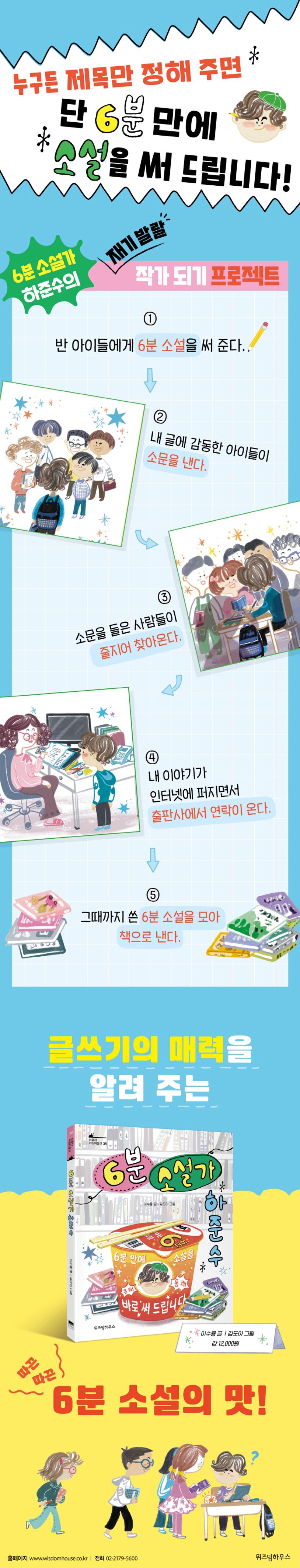 열한 살 하준수는 작가가 되기 위해 6분 소설가 간판을 학교 책상에 세웁니다. 누구든 제목만 정해 주면 6분 만에 따끈따끈한 소설을 써 주는 거지요. 그런데 하필 첫날부터 별명 짓기 대장 박윤빈과 엮이면서 ‘악마의 연필’이라는 최악의 별명만 얻게 됩니다. 하지만 여기서 포기하면 6분 소설가 하준수가 아니죠! 하준수가 쓴 재치와 유머가 가득한 6분 소설과 함께 글쓰기의 매력에 빠져 보세요.