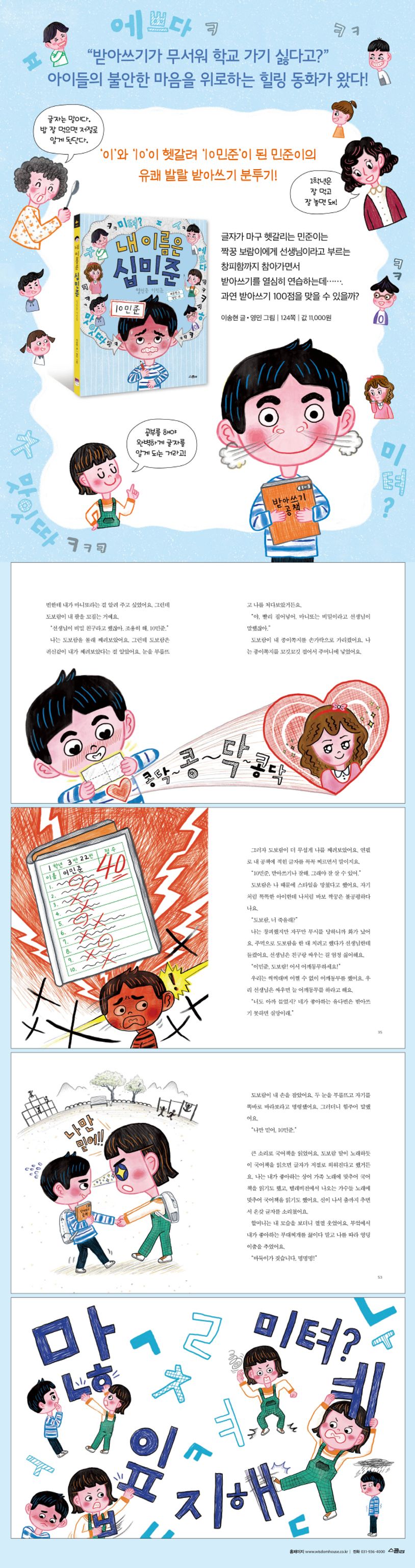 민준이는 초등학교 첫날부터 ‘10민준’이라고 이름을 잘못 적는 바람에 ‘십민준’이라는 싫어하는 별명이 생겼다. 집에서 학습지를 풀며 한글 공부를 열심히 했는데, 받아쓰기만 보았다 하면 ‘○’보다 ‘×’가 많다. 좋아하는 다빈이는 엄마가 똑똑한 아이랑 놀라고 했다며 받아쓰기를 더 잘 보라고 말한다. 다빈이에게 고백할 수 있게 한글 공부를 시켜 주겠다는 짝꿍 보람이는 대놓고 이런 것도 모르냐며 바보 취급이다. 학교에 가면 즐거운 일이 가득 생길 줄 알았는데, 그놈의 받아쓰기 때문에 학교생활이 자꾸만 꼬이는 것 같다. 과연 민준이는 받아쓰기 100점을 맞고 행복한 1학년이 될 수 있을까?