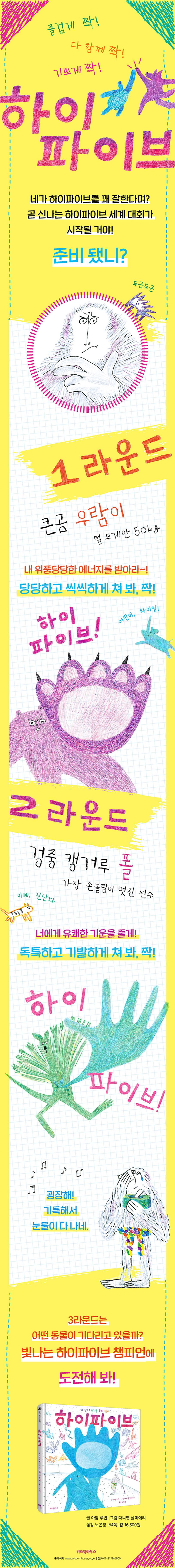 유쾌한 에너지를 주고받는 ‘하이파이브’! 이 책은 어린이 독자가 하이파이브 세계 대회에 참가해 라운드마다 동물 친구들과 신나는 하이파이브 대결을 펼치는 그림책이에요. 고릴라 사부님이 어린이 독자를 자연스럽게 책 속 주인공으로 초대하지요. 재미난 상상력으로 남들과는 다른 개성 넘치는 하이파이브를 시도해 보세요! 매 라운드에 도전할 때마다 어린이 독자는 즐거운 기분을 만끽할 수 있을 거예요. 신나고 활기찬 기운을 전하는 마법 같은 책! 준비 됐으면 함께 즐거운 기운을 나눠 보아요. 짝!