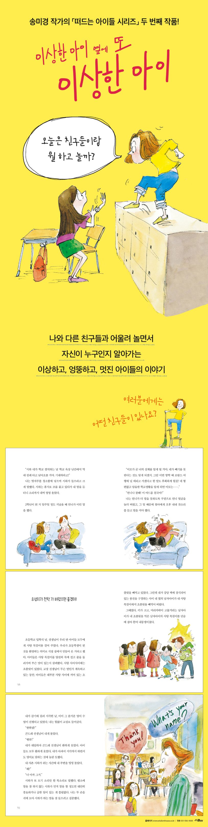오싹하고 슬프고 재미있고 기이한 작품 세계를 선보이며 한국 아동문학의 패러다임을 바꿔 놓은 송미경 작가가 신작 ?이상한 아이 옆에 또 이상한 아이?를 펴냈다. 2017년 출간된 「떠드는 아이들 시리즈」 첫 번째 작품 ?어쩌다 부회장?에 이은 두 번째 작품이다. 아이들에게 아무 근심 걱정 없이 그냥 재미있게 놀면서 하루를 보내면 된다는 말을 하고 싶었다는 그는 동화에 등장하는 이상하고 엉뚱한 다섯 아이를 통해 “나와 다른 친구들과 어울려 놀면서 우리는 자신이 누구인지 더 자세히 알게 된다”는 것을 보여준다. 조미자 작가의 자유분방한 그림이 더해져, 잘 노는 게 얼마나 중요한지, 또 잘 노는 아이가 얼마나 멋진지 다시 한 번 생각해 보게 한다.