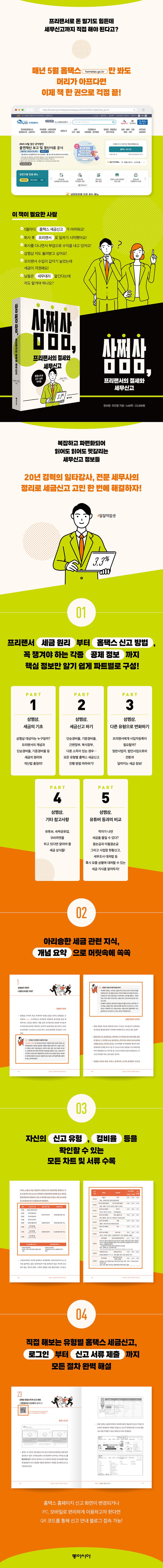 3.3% 세금 환급받을 수 있다던데 나도 환급받을 수 있을까? 프리랜서로 일하고 있는데 수입금액이 늘었다면? 개인사업자 등록을 고민 중이라면? 프리랜서 종합소득세 신고 어떻게 하는 걸까? 일타강사 세무사 장보원과 국제조세, 프리랜서 전문 세무사 조인정 세무사가 매년 5월이 두려운 프리랜서들을 위한 종합소득세 신고ㆍ납부 바이블 『삼쩜삼, 프리랜서의 절세와 세무신고』를 냈다. 다양한 세무 업무 경험과 전문성을 통해 두 저자는 프리랜서 세금의 기초 원리부터 실제 홈택스 신고 방법까지 프리랜서 종합소득세의 모든 것을 담아냈다. 프리랜서 및 개인사업을 시작한 지 얼마 되지 않아 세금에 대해 잘 모르고 있다면, 수입이 늘어 절세 방법을 알아보고 있다면 이 책을 통해 매년 5월 손해 보지 않는 현명한 세무신고를 단번에 익힐 수 있을 것이다.