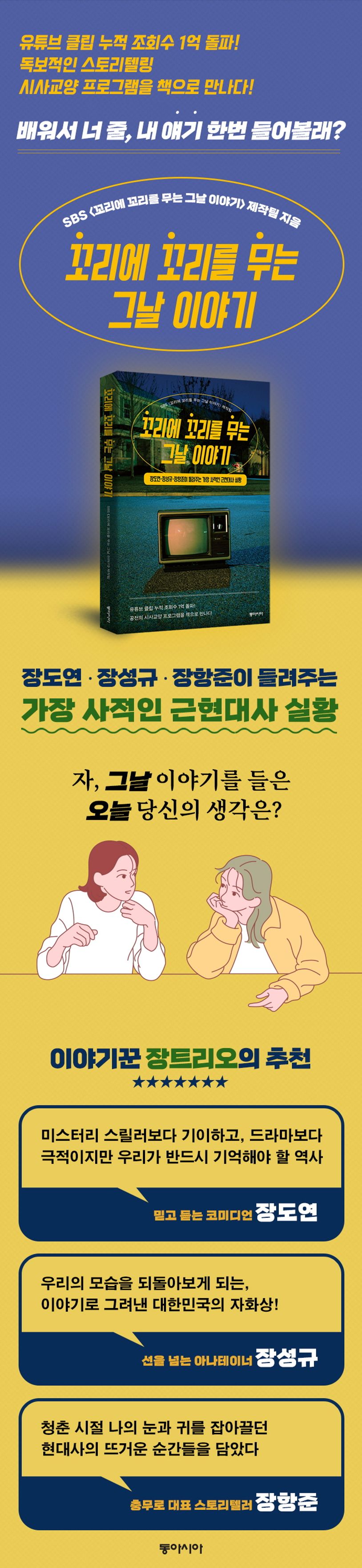 영국의 역사학자 아놀드 토인비(Anold Toynbee)의 말이다. 우리는 ‘○○○ 사건’이라는 이름으로 역사책에 한 줄로 새겨진 역사를 배우면서도 그 중심에 선 ‘사람’이 무슨 생각을 했고, 어떤 맥락에서 사건을 일으켰는지는 알지 못한다. 〈꼬꼬무〉의 연출을 맡은 최삼호 PD는 “사건의 중심에는 여지없이 ‘사람’이 있다”라는 말로 〈꼬꼬무〉의 기획·제작 의도를 명쾌하게 축약한다. 마찬가지로, 이 책 『꼬리에 꼬리를 무는 그날 이야기』가 근현대사의 여러 가지 사건들을 통해서 캐치해내는 것은 역사적인 사실관계가 아니다. 사건이 일어나기까지 존재했던, 또한 사건 전후에 계속해서 상호작용을 일으키며 끊임없이 변화하는 ‘사람’의 이야기다. 그렇기에 이 책이 이야기하는 것은 정보나 지식이 아니오, ‘이야기’ 그 자체다. 그리고 그 이야기를 듣고, 말하는 시간은 우리에게 역사를 넘어서, ‘우리 자신’을 들여다볼 기회를 선사한다.