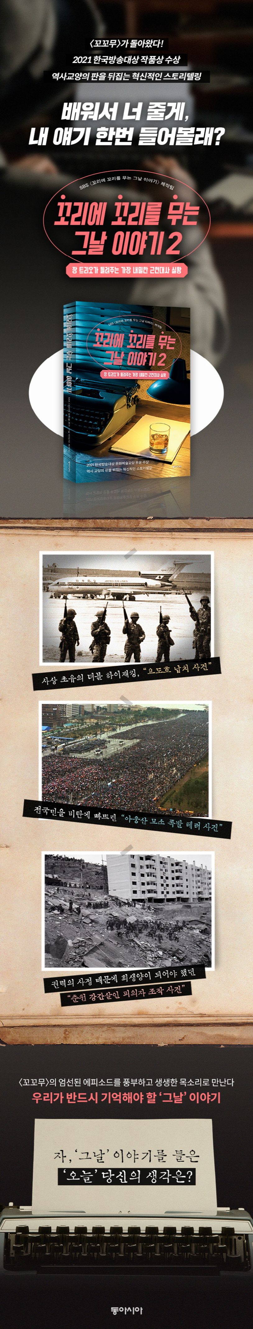 『꼬리에 꼬리를 무는 그날 이야기』에 이어 출간된 『꼬리에 꼬리를 무는 그날 이야기 2』는 SBS에서 제작·방영하는 동명의 시사 교양 프로그램 〈꼬리에 꼬리를 무는 그날 이야기 시즌2〉에서 방영한 에피소드를 모아 단행본으로 재구성한 책이다. 〈꼬꼬무〉는 파일럿 방송과 시즌제 방송을 넘어서 정규 방송으로 편성된 상태지만 기본적인 포맷은 그대로 유지되고 있다. ‘장 트리오’라고 불리는 세 명의 발화자가 각기 초대한 이야기 친구와 시청자를 대상으로 역사에 큰 자취를 남긴 커다란 사건의 이야기를 들려준다. 이야기를 성공적으로 구성하기 위해서는 물론 풍부한 자료가 필요하다. 〈꼬꼬무〉 제작팀은 효율을 도외시한채, 이야기를 풀어나가기 위한 온갖 자료를 그러모은다. 공식 기록과 수사보고서, 사건 당시의 언론 보도자료, 생존자의 인터뷰, 떠나간 이의 녹취록…. 그렇게 자료를 하나하나 그러모음으로써 비로소 보이는 것이 ‘진실’의 편린이다. 제작팀은 책의 서문에서, ‘가장 기분 좋으면서도 마음을 무겁게 했던 평’이라고 칭하며, 민용준 대중문화 칼럼니스트의 비평을 인용한다.