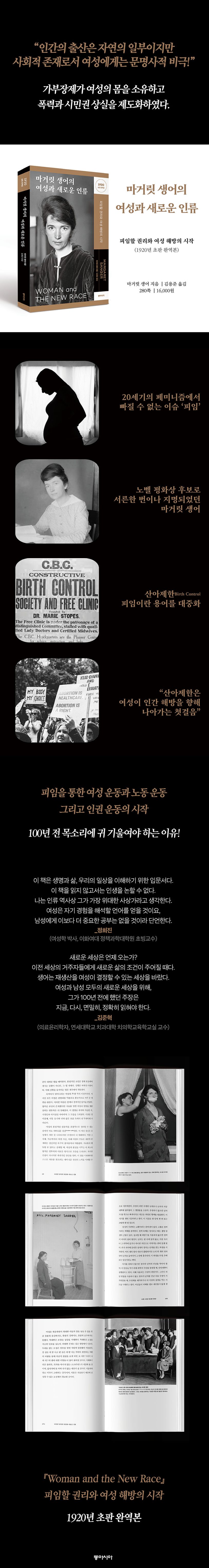 『마거릿 생어의 여성과 새로운 인류(Woman and the New Race)』는 1920년 출간된 마거릿 생어(Margaret Sanger, 1879~1966)의 대표작이다. 생어는 생전에 “산아제한은 본질적으로 여성교육”이라며 “피임은 여성이 자유라는 목표를 향해 나아가는 중요한 첫걸음이자 인간 평등을 위한 첫걸음이다. 더 나아가 인간 해방을 향한 첫걸음이라고도 할 수 있다.”라고 했다. 이처럼 마거릿 생어의 여성 운동은 단순히 여성 인권 신장에 국한되지 않는다. 노동 문제에서부터 아동 인권에 이르기까지 인류 전반의 인권 문제를 포괄한다고 할 수 있다.