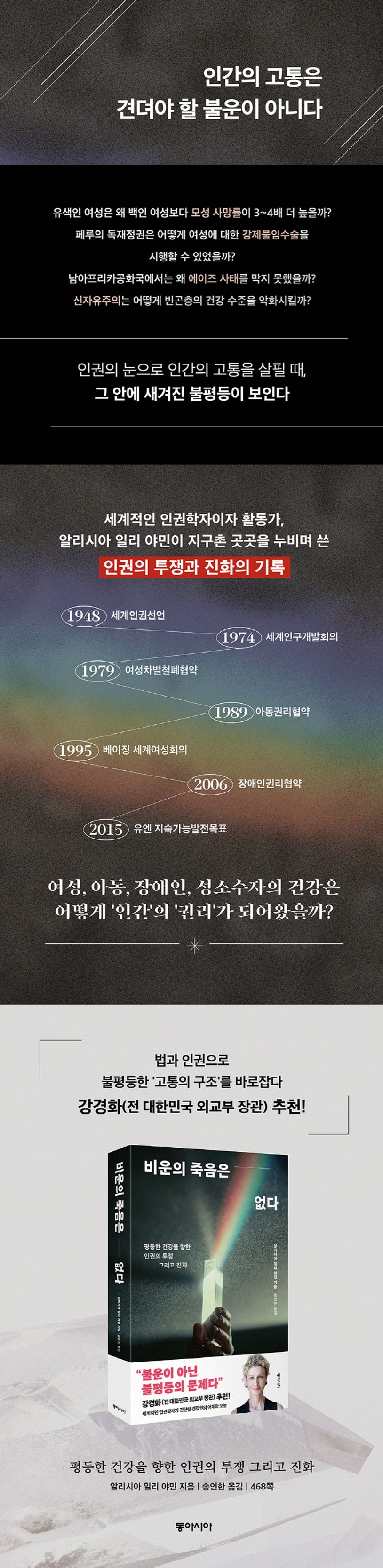 세계적인 인권학자이자 건강 옹호 활동을 지속해 온 활동가 알리시아 일리 야민이 지난 30년(1991년~2019년) 동안 건강에 대한 법과 권리가 진화해 온 과정을 비판적으로 성찰한 『비운의 죽음은 없다』가 출간되었다. 법과 제도를 통해 건강권을 현실화하는 데 앞장서 온 저자는, 브라질·페루·콜롬비아·칠레·남아프리카공화국·탄자니아 등을 누비며 지구촌 곳곳에서 벌어진 죽음과 고통을 ‘인권’의 렌즈로 파헤친다. 그렇게 개인의 불운으로 여겨졌던 각각의 죽음들을 사회적·정치적·경제적 불평등이 만들어 낸 인류 공동의 역사로 바꿔나간다. 『비운의 죽음은 없다』는 국가의 폭력과 불평등한 사회제도, 신자유주의 경제질서가 사회적 약자들의 건강을 어떻게 상하게 만드는지를 추적하며, 아동·여성·성소수자 등의 건강이 권리의 영역으로 발전해 온 과정을 설명한다. 책의 옮긴이 서문을 쓴 연세대학교 사회복지대학원 정신보건·보건의료복지 교수 송인한의 말처럼, 이 책은 “불평등과 차별을 넘어, 인간의 건강을 마땅히 누려야 할 정의로운 권리로 만드는” 초석이 될 것이다.