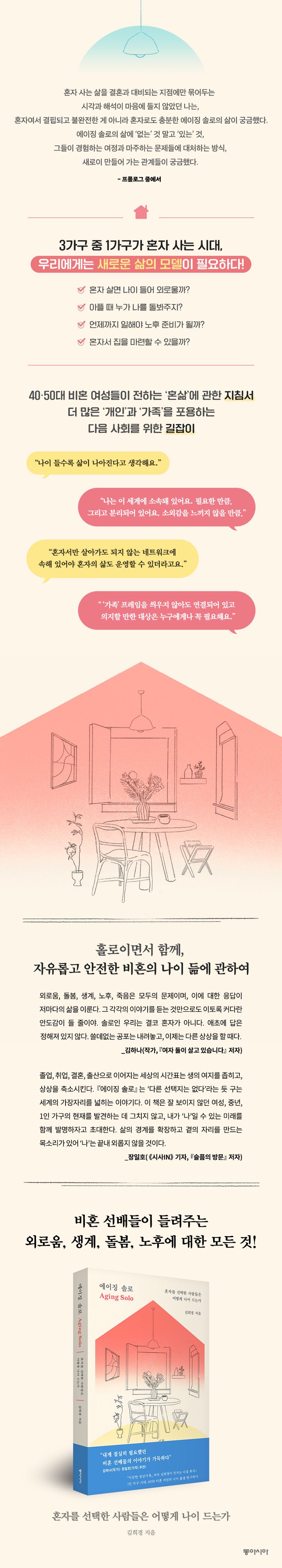 『에이징 솔로』는 1인 가구 논의에서 공백이었던 비혼 중년의 삶을 조명하는 책이다. 저자는 혼자 살아가는 비혼 중년으로서, 자신처럼 혼자 사는 40·50대 비혼 여성 19명을 만나 한국 사회에서 결혼을 선택하지 않은 이유, 외로움에 대처하고 친밀감을 만들어 가는 방법, 노후를 준비하는 여정에 관해 대화를 나누었다. 제각기 다채롭고 풍성한 에이징 솔로의 이야기는 혼자 나이 들어가는 모든 이들이 참고할 지침서이자, 1인 가구 집단과 1인 가구 사회를 이해하는 데 가장 정확한 길잡이가 될 것이다.