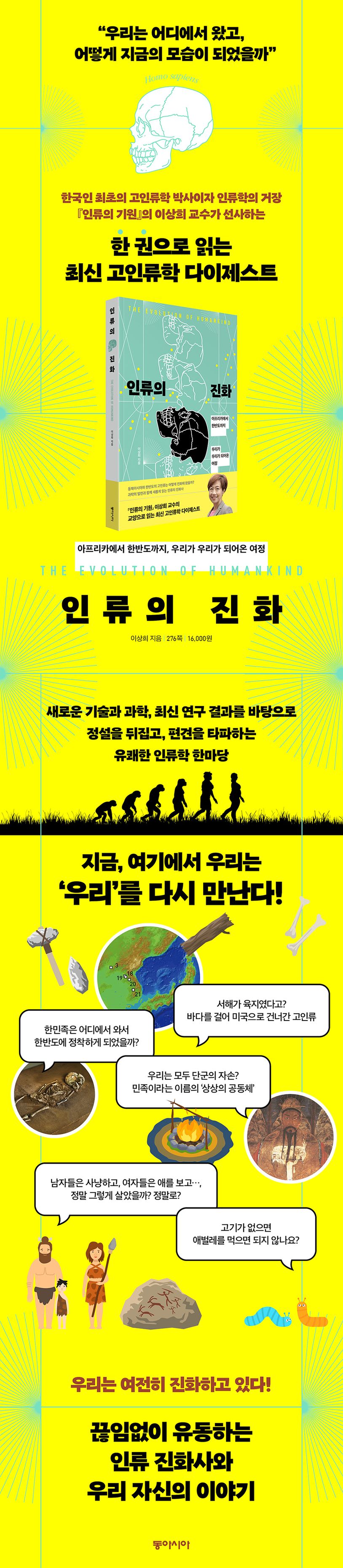 저자는 오스트랄로피테쿠스, 호모 에렉투스, 호모 날레디 등 고인류의 존재와 그들의 특징을 살펴보며, 지속적으로 업데이트되는 최신 연구를 바탕으로 인류의 진화에 관한 가장 혁신적인 지식을 소개한다. 특히 아프리카에서부터 한반도까지 인류 진화의 발자취를 따라가면서, 이전에는 연구되지 않았던 한반도 고인류에 관한 흥미진진한 이야기를 풀어낸다. 우리의 뿌리를 찾고자 하는 사람들에게 있어서 절대로 놓칠 수 없는 한 권이 될 것이다.