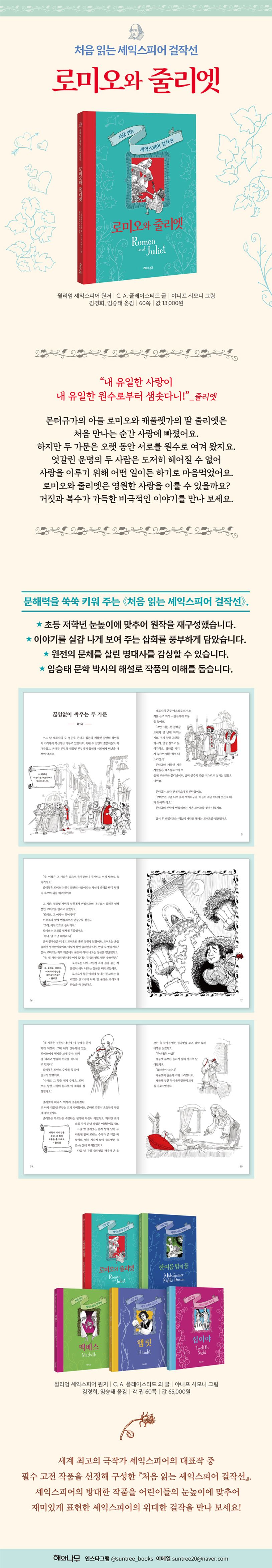 셰익스피어의 수많은 작품 중, 극작가였던 셰익스피어에게 큰 명성을 가져다준 작품은 《로미오와 줄리엣》이에요. 오랜 시간 다양한 콘텐츠로도 선보이고 있는 《로미오와 줄리엣》은 사랑의 비극을 담은 문학 중 가장 유명한 작품이지요. 두 귀족 가문의 긴 싸움에도 불구하고 몬터규가의 아들 로미오와 캐풀렛가의 딸 줄리엣에게 운명 같은 사랑이 찾아와요. 둘은 처음 만나는 순간 사랑에 빠졌지요. 로미오와 줄리엣은 도저히 헤어질 수 없어 사랑을 이루기 위해 어떤 일이든 하기로 마음먹어요. 결코 둘의 사랑은 순탄치 않았어요. 운명의 장난으로 엇갈린 로미오와 줄리엣은 결국 비극적 결말을 맞게 되지요. 하지만 두 젊은이의 죽음으로 증오로 가득 찼던 두 가문은 화해하게 돼요. 죽음마저 막지 못했던 두 사람의 순수한 사랑을 그려 낸 《로미오와 줄리엣》을 만나 보세요.