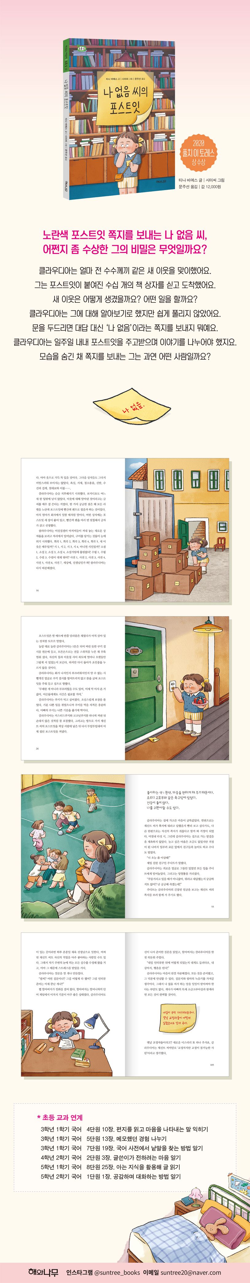 해와나무 책 읽는 어린이 초록잎 시리즈 12번째 동화 《나 없음 씨의 포스트잇》은 2020년 폴치 이 토레스 청소년 문학상을 받은 작품입니다. 폴치 이 토레스 상은 1900년대 스페인내전 전후로 스페인 어린이문화 및 문학에 힘쓴 작가이자 어린이 잡지 발행인 조셉 마리아 폴치 이 토레스를 기리는 문학상으로, 스페인의 권위 있는 어린이 청소년 문학상으로 손꼽힙니다. 본 도서는 주인공이 수수께끼 같은 새 이웃을 만나고 소통하며 그에 대해 알아가는 과정을 흡입력 있는 구성으로 그려 냈다는 평가를 받았습니다.