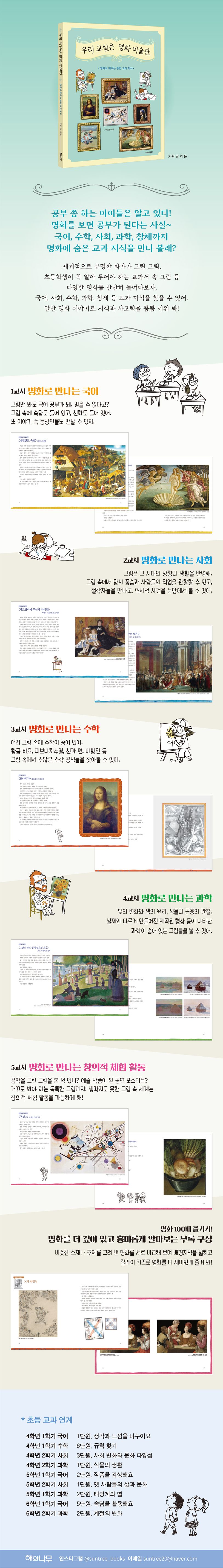 《우리교실은명화미술관》은이러한시대적배경에서착안하여기획되었다.명화를감상하는것에서더나아가미술에서국어,사회,과학,수학,창의적체험등다양한교과지식을찾아보며융합적사고력을갖출수있도록돕는다.딱딱한설명글대신친숙한입말체의화자가등장해다소어려울수있는명화이야기를말랑말랑하게풀어준다.교과지식뿐아니라명화를그린작가들의이야기또한살펴볼수있으며,비슷한주제와소재를다룬명화를비교해보는코너와‘릴레이명화퀴즈’로명화에대한다양한놀이와퀴즈등을즐길수있다.