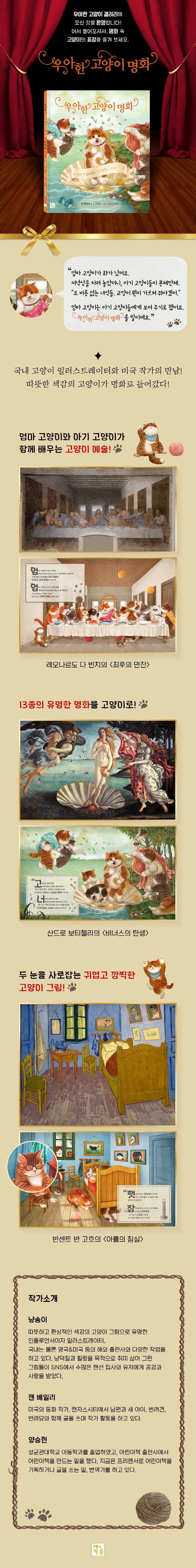 〈우아한 고양이 명화〉는 엄마 고양이가 열두 마리 짓궂은 아기 고양이에게 ‘고양이 명화’를 보여주며 고양이 예절도 가르치고 삶의 철학도 말해 주는 그림책입니다. 이미 널리 알려진 〈비너스의 탄생〉, 〈최후의 만찬〉, 〈아를의 침실〉 등 13종의 유명한 명화를 귀엽고 깜찍한 고양이들로 재탄생시켜 독자들의 두 눈을 사로잡습니다.