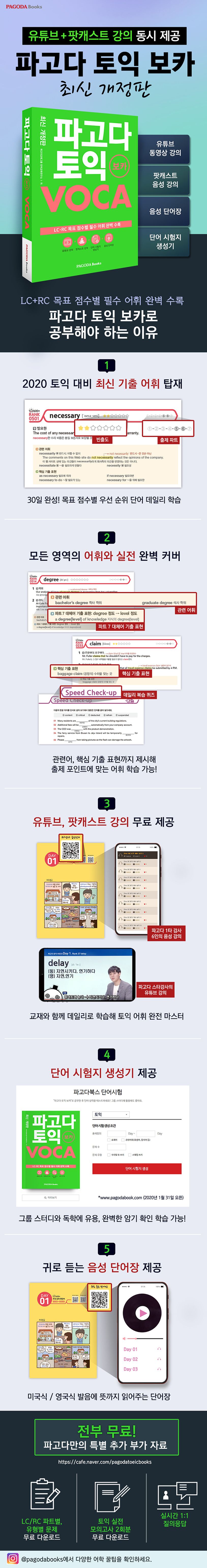 파고다 토익 보카의 최신 개정판이다. 600+, 700+, 800+, 900+ 목표 점수별로 필수 암기해야 할 기출 어휘를 중요도 순으로 배치했다. 토익 시험에서 고득점 할 수 있도록 출제 포인트에 맞는 뜻, 용법(usage)을 집중적으로 학습하고, 기출 표현을 통해 실전 문제에서의 쓰임까지 마스터할 수 있다. 숙어, 연결어, 구어체 등의 학습자료와 파고다 1타 강사진의 유튜브, 팟캐스트 강의, 단어시험 생성기 등의 서비스를 추가로 지원한다.