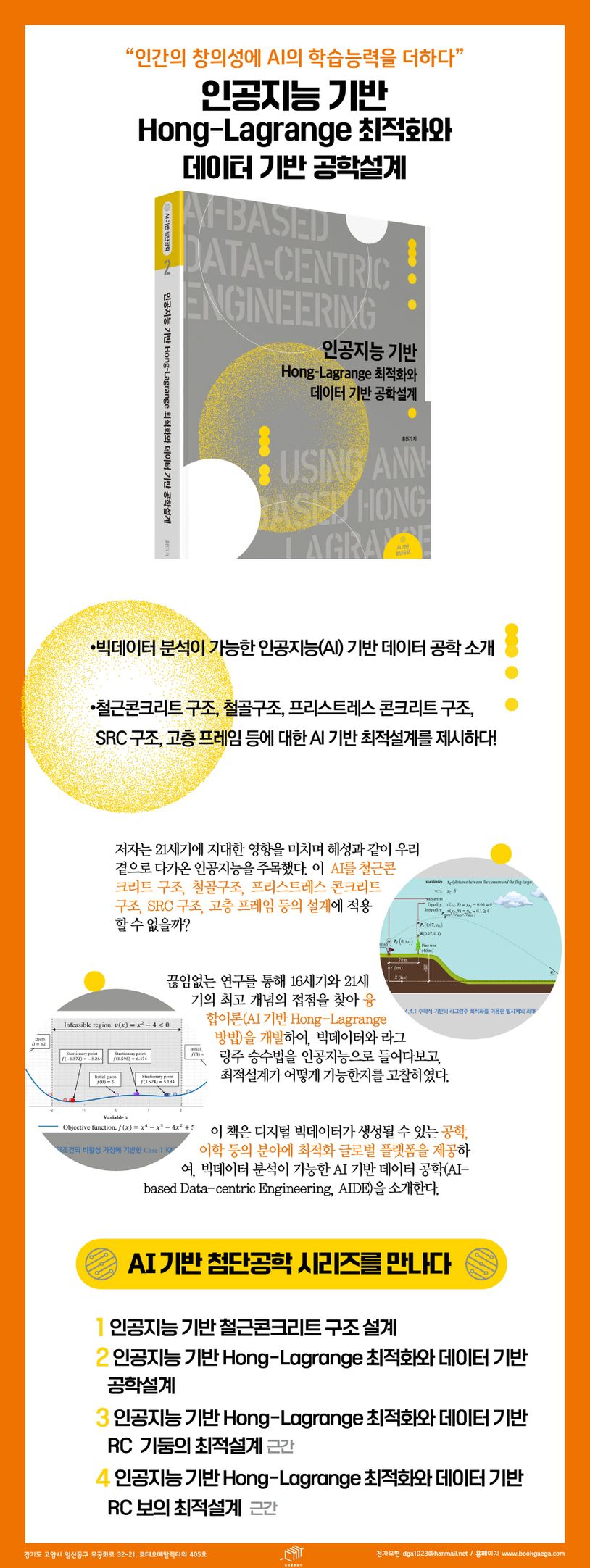 저자는 21세기에 지대한 영향을 미치며 혜성과 같이 우리 곁으로 다가온 인공지능을 바라보게 되었다. 이 둘은 접점이 전혀 없을까? 16세기와 21세기의 최고 개념의 접점을 찾아 융합이론(AI 기반 Hong-Lagrange 방법)을 개발하여, 빅데이터와 라그랑주 승수법을 인공지능으로 들여다보고, 최적설계가 어떻게 가능한지를 고찰하였다. 저자는 이 책을 통해 디지털 빅데이터가 생성될 수 있는 공학, 이학 등의 분야에 최적화 글로벌 플랫폼을 제공하여, 빅데이터 분석이 가능한 AI 기반 데이터 공학(AI-based Data-centric Engineering, AIDE)을 소개하였다. 혹시 독자들 중 어떤 분야이든지 자신들만의 디지털 빅데이터가 있다면, 이 책이 제시하는 인공신경망과 라그랑주 승수법에 기반해서 최적값을 찾아보기를 권해본다.