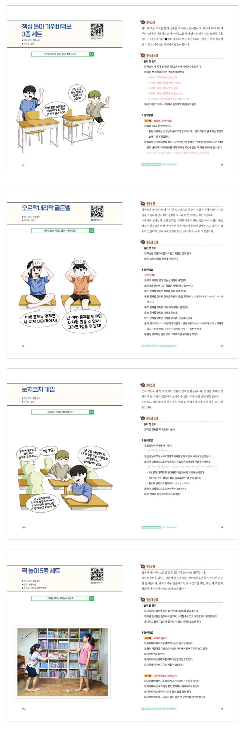 이 책은 언택트로도 충분히 재미있고 즐겁게 활동이 가능한 것을 선별하여 약간의 변형을 거친 놀이들로 구성했습니다. 시험 대형에서 마스크 쓰고 거리를 두며 비접촉으로도 가능하기 때문에 일반적인 상황에서는 더욱 쉽고 간편하게 적용이 가능한 놀이 활동입니다.