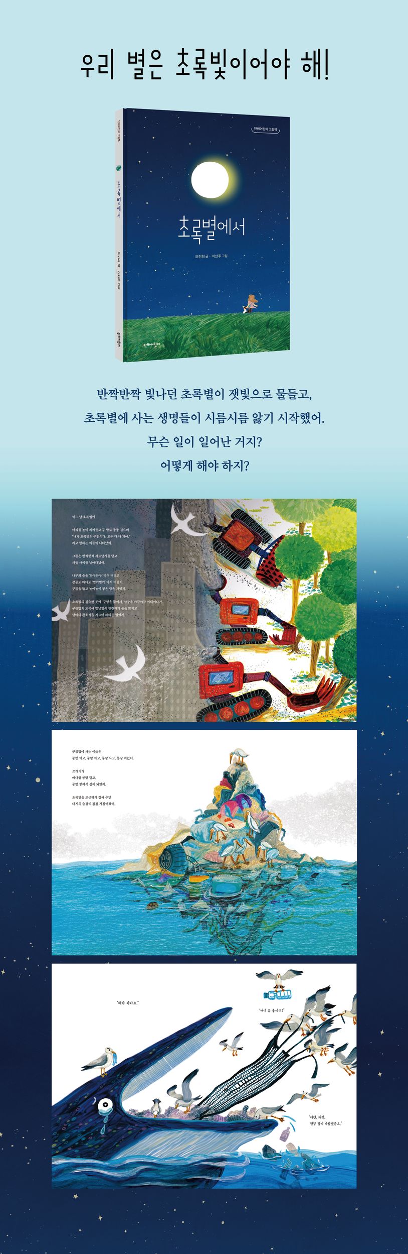 《초록별에서》 그림책은 어떻게 하면 우리가 사는 지구가 지속가능할 지를 담은 그림책이에요. 인간의 끝없는 잘못된 욕심이 동물들의 서식지를 파괴하고 그 결과 수많은 동물이 지구에서 사라졌어요. 또한, 인간의 과도한 자원 소비는 기후변화를 일으키면서 생태계 파괴로 이어지는 끝없는 악순환이 일어나고 있지요. 이대로 가다가는 지구에서 그 어떤 생명체도 살지 못하게 될지 몰라요. 인간도 마찬가지지요. 이런 비극이 일어나지 않게 하기 위해서는 지금이라도 우리 모두가 지구를 지키기 위해 행동에 나서야 하지요. 《초록별에서》 그림책에서는 우리 지구가 어쩌다 병들게 되었는지, 그래서 지구 위에 어떤 일들이 일어나게 되었는지를 보여 줘요. 하지만 이런 상황에서도 절대 포기하지 않고 초록별 지구를 지켜 낸 사람들의 이야기도 담겨 있지요. 누가 초록별 지구가 다시 반짝반짝 빛나게 할 수 있었을까요?