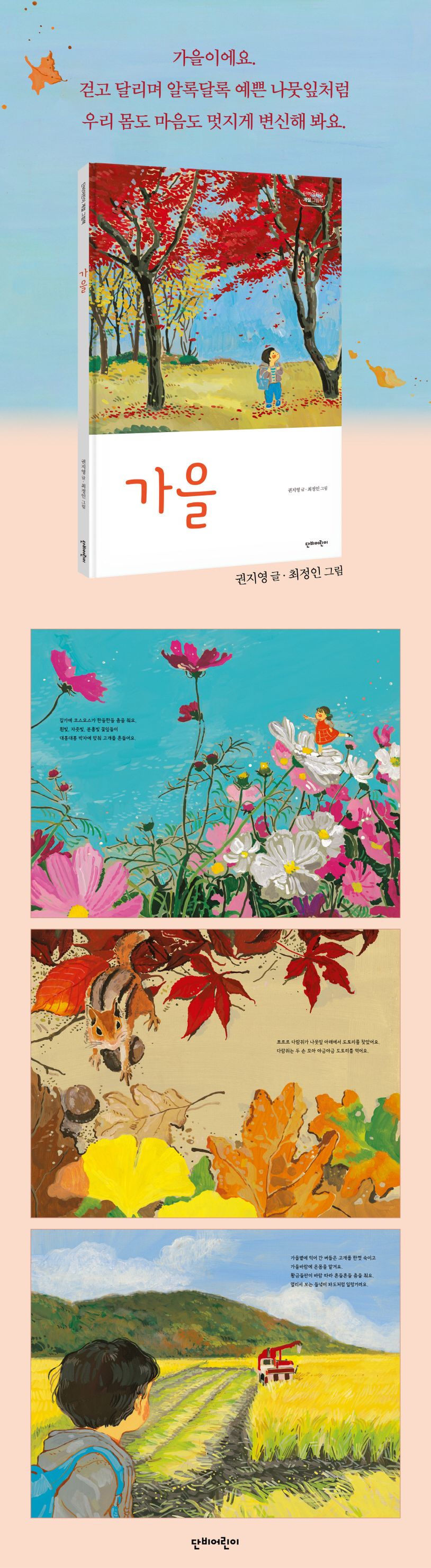감성적이고 생동감 넘치는 글과 그림으로 참 예쁜 가을을 만끽하게 하는 그림책이에요. 가을은 그 어느 계절보다 풍성하고 다채롭고 변화무쌍한 계절이에요. 한들한들 춤추는 코스모스, 바람이 불 때마다 한 장 한 장 떨어지는 노란 은행잎, 별처럼 빛나는 빨간 단풍빛, 도토리를 두 손으로 야금야금 먹는 다람쥐, 바람에 뒹굴뒹굴 길거리를 쏘다니는 낙엽, 옷깃을 여미는 사람들 등과 같은 풍성하면서도 쓸쓸한 가을 풍경을 통해 가을이 주는 아름다움을 만끽해 보세요. 그리고 가을과 딱 어울리는 책 읽기와 편지 쓰기를 하며 가을을 즐겨 봐도 좋아요.