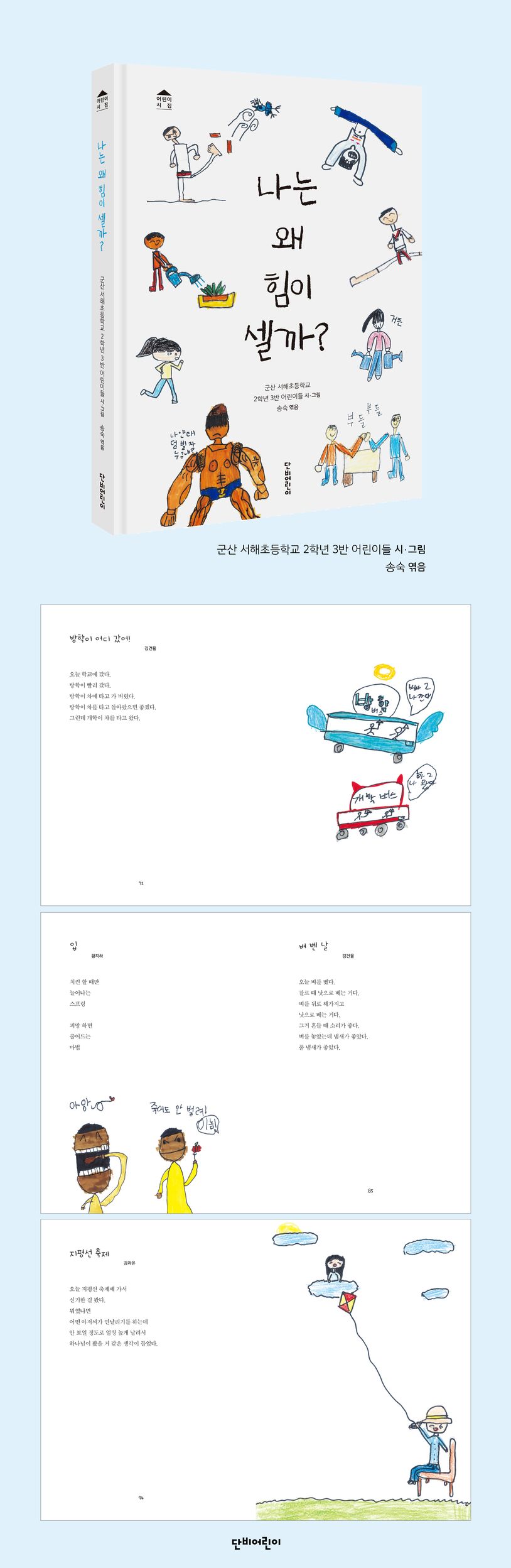 《나는 왜 힘이 셀까?》는 군산 서해초등학교 2학년 3반 어린이들이 쓰고 그린 시를 엮은 어린이 시집이에요. 아이들은 학교 텃밭과 운동장, 교실과 집, 가족과 친구들 사이에서 마주한 순간들을 자기만의 말로 시에 담았어요. 아이들의 시는 세상을 설명하려 애쓰기보다는 느낀 그대로를 솔직하게 꺼내 놓지요. 그래서 이 시집에는 웃음이 나다가도 고개가 끄덕여지는 문장들이 함께 들어 있어요. 짧은 문장 속에는 아이들만이 할 수 있는 반짝이는 질문과 관찰이 살아 있어요. 왜 힘이 세질 수밖에 없는지, 왜 어떤 순간은 무섭고 어떤 순간은 괜히 기쁜지. 이 시집을 읽다 보면, 어른들도 잊고 지냈던 어린 시절의 감각과 마음이 조용히 되살아난답니다.