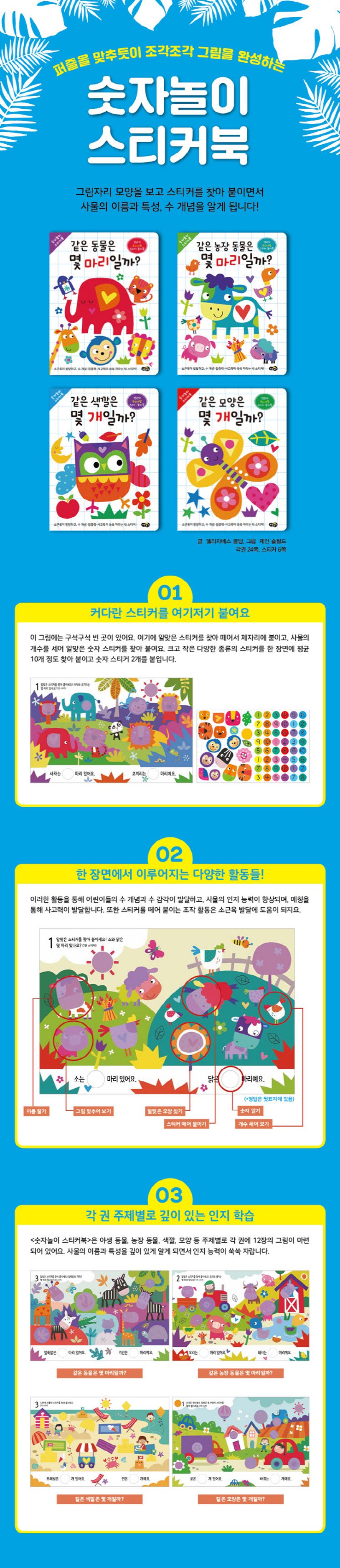 어린이가 이 한 장면을 완성하기 위해서는 알맞은 색깔 찾기, 알맞은 모양 찾기, 사물의 이름 알기, 개수 세어 보기, 숫자 알기, 그림 맞추어 보기, 스티커 떼어 붙이기 등 다양한 활동이 이루어집니다. 이러한 활동을 통해 어린이들의 수 개념과 수 감각이 발달하고, 다양한 색깔의 특성과 이름을 알아보면서 색에 대한 감각과 인지 능력이 향상되며, 매칭을 통해 사고력이 발달합니다. 또한 스티커를 떼어 붙이는 조작 활동은 소근육 발달에 도움이 되지요. 마치 여러 조각으로 구성된 퍼즐을 맞추듯이 스티커를 붙여 한 장 한 장 그림을 완성하다 보면 성취감을 느끼게 될 것입니다.