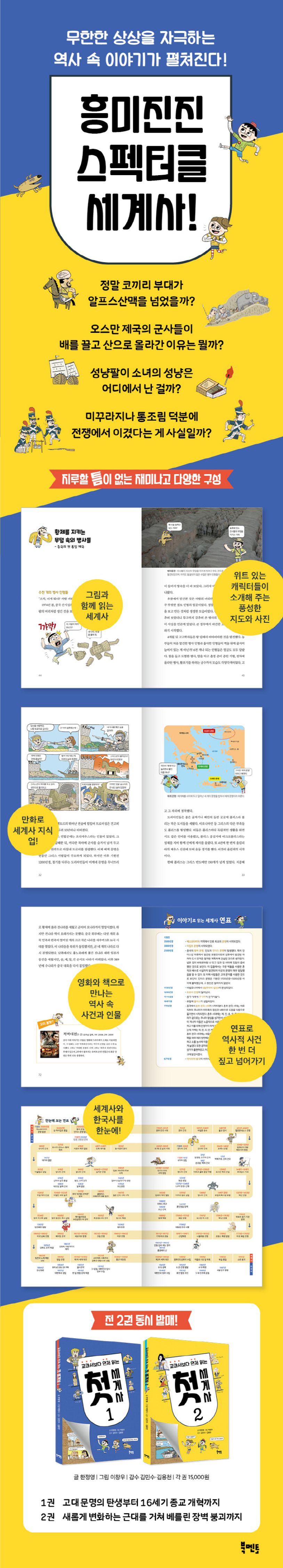 세계사를 처음 접하는 청소년들이 부담 없이 쉽고 재미나게 읽을 수 있는 《교과서보다 먼저 읽는 첫 세계사(전 2권)》가 드디어 출간되었다. 이 책에서는 청소년 독자들의 호기심을 자극하는 역사 이야기가 다채롭게 펼쳐진다. 고대 문명의 탄생부터 16세기 루터의 종교 개혁까지 다루는 1권, 중세의 틀을 벗고 새롭게 변화하는 근대에서부터 산업 혁명, 세계 대전과 베를린 장벽의 붕괴까지 다루는 2권으로 고대부터 현대까지 세계사를 한 번에 짚어 볼 수 있다. 무엇보다 기발하고 엉뚱하며 때로 믿기 어려울 정도로 놀라운 책 속 이야기들은 세계사란 먼 나라의 지루한 옛이야기가 아니라 때론 아름다운 사랑 이야기이고, 때로 으스스한 스릴러물이며, 때로 스펙터클한 영웅전이라는 사실을 제대로 보여 준다.