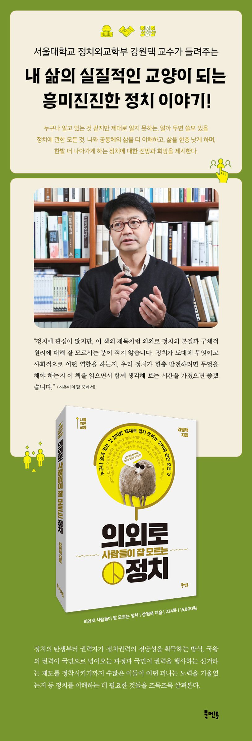 우리 시대의 대표적인 정치학자로 칼럼과 강연, 저술 활동을 비롯해 정치 현장에서 치열한 정치 비평과 진단 작업을 활발하게 해 온 강원택 서울대학교 정치외교학부 교수가 시민들을 위한 쉽고 친절한 정치 원리 교양서를 출간했다. 정치의 탄생부터 권력자가 정치권력의 정당성을 획득하는 방식, 국왕의 권력이 국민으로 넘어오는 과정과 국민이 권력을 행사하는 선거라는 제도를 정착시키기까지 수많은 이들이 어떤 피나는 노력을 기울였는지 등 정치를 이해하는 데 필요한 것들을 조목조목 살펴본다. 더불어 사회의 다양한 생각과 수많은 갈등 상황을 올바른 방향으로 공정하게 잘 조율해 내기 위해 반드시 필요한 정치의 본질적 역할에 대해서도 다시 한번 더 생각해 보게 한다.