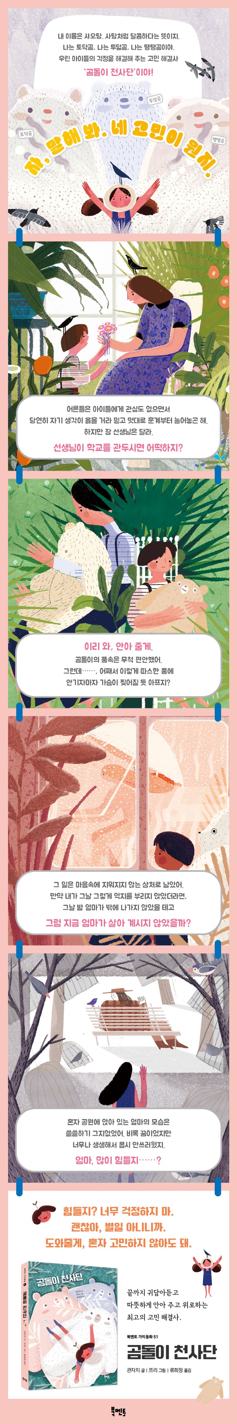 《곰돌이 천사단》은 성장기를 뚫고 한 발 나아가려는 아이들의 불안과 걱정, 고민 가득한 마음을 복슬복슬하고 따뜻한 위로와 응원으로 어루만져 주는 동화다. 대만 아동문학계에서 활발한 창작 활동을 펼쳐온 동화 작가 관자치는 아이들이 마음을 털어놓을 수 있는 존재인 ‘곰돌이 천사단’과 마음을 터놓고 이야기할 수 있는 ‘환상의 공간’이라는 설정을 통해 아이들이 겪는 여러 가지 문제 상황을 스스로 마주할 수 있게 돕고, 걱정과 고민을 해소해 나가는 과정을 따뜻하고 서정적인 감성으로 담아냈다. 《곰돌이 천사단》을 읽으며 우리 모두 ‘곰돌이 천사단’이 되어 아이들의 이야기를 귀 기울여 들어 주고 진지하게 응답함으로써 어린이들이 자신의 세상을 건강하게 만들어 갈 수 있게 되기를 희망한다.