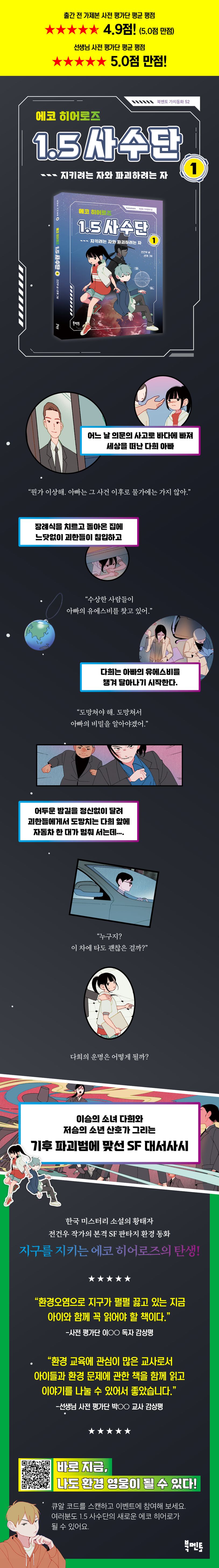 〈에코 히어로즈 1.5 사수단 시리즈〉는 기후 파괴범에 맞서 싸우는 이승의 소녀 다희와 저승의 소년 산호의 모험을 그린 어린이 환경 동화 시리즈입니다. 어느 날 의문의 사고로 아버지를 잃은 다희는 괴한들의 습격을 받습니다. 아빠 회사 동료의 도움으로 가까스로 괴한들을 피한 다희는 운명처럼 1.5 사수단에 합류하게 됩니다. 그곳에서 저승의 소년 산호를 만나게 되지요. 그리고 사실은 아빠가 지구 환경을 지키기 위해 활동하던 1.5 사수단의 비밀 요원이었다는 사실도 알게 됩니다. 지구를 파괴하려는 검은 지구단의 음모를 알게 된 다희는 아빠의 뒤를 이어 불의에 맞서 싸우기로 결심하는데요. 과연 다희는 지구의 평화와 자신의 미래를 지켜낼 수 있을까요?