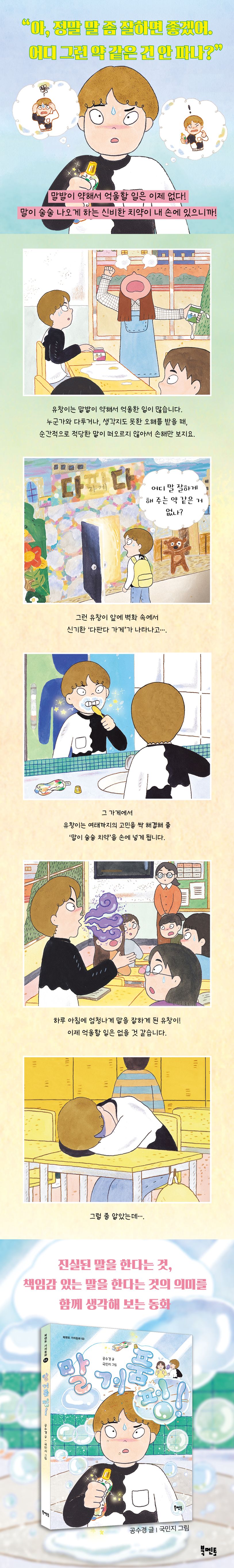 《말 거품 펑!》은 진실된 말하기란 무엇인지 어린이와 함께 진지하게 고민해 보는 이야기예요. 주인공 유창이는 늘 억울한 기분이 들어요. 말주변이 없어서 손해만 보거든요. 말다툼할 때면 말이 턱! 하고 목구멍에 걸려 하나도 나오지 않는데, 집에 돌아와서 생각하면 ‘그때 이렇게 말했어야 하는데!’ 하는 생각이 뒤늦게 납니다. 그런데 어느 날, 유창이 손에 ‘말이 술술 치약’이라는 이상한 치약이 들어옵니다. ‘이 치약을 사용하면 말을 잘하게 된다고? 전부 과장 광고 아니야?’ 과연 ‘말이 술술 치약’은 늘 억울한 유창이를 변화시켰을까요?