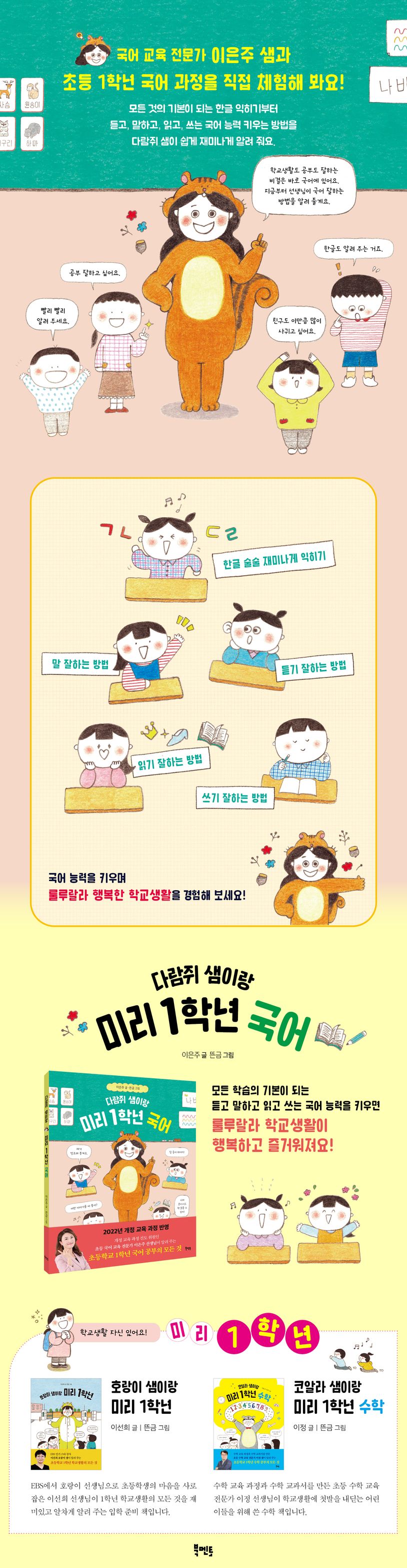 《다람쥐 샘이랑 미리 1학년 국어》는 2022년 개정 교육 과정을 적용하여, 개정 교육 과정 선도 위원인 초등 국어 교육 전문가 이은주 선생님이 학교생활에 첫발을 내딛는 어린이들을 위해 쓴 국어책입니다. 초등학교 입학을 앞두면, 가장 먼저 준비해야 할 것이 한글 익히기입니다. 한글을 모르면 학교 수업을 제대로 따라갈 수 없기 때문이지요. 그래서 입학 전에 한글을 완전히 떼야 하는지, 학교에 가서 한글을 배워도 늦지 않은지, 효과적인 한글 익히기 방법은 무엇인지 등등 학부모들은 한글 떼기와 관련하여 궁금증이 많습니다. 이 책에서는 초등 국어 전문가인 이은주 선생님이 한글 익히기부터 시작되는 초등 1학년 국어 전체 과정을 친절하고 꼼꼼하게 알려 줍니다. 한글을 언제 어떻게 익히면 좋은지부터 모든 학습이 기본이 되는 잘 듣고, 말하고, 읽고, 쓰는 국어 능력 키우는 방법까지 알려 주어 행복하고 즐거운 1학년을 보낼 수 있게 도와줍니다.