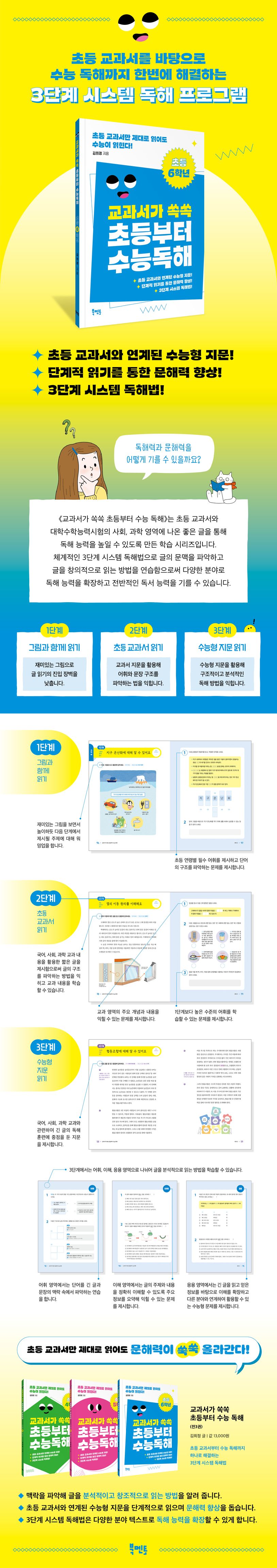 초등 교과서 텍스트를 바탕으로 어린이의 독해 문해력을 향상시킬 수 있는 학습 시리즈 〈교과서가 쏙쏙 초등부터 수능 독해〉의 세 번째 책 《교과서가 쏙쏙 초등부터 수능 독해 - 초등 6학년》 편이 출간되었습니다. 이 책은 사회 전반으로 관심이 높은 문해력 발달에 중점을 두고 초등 교과서와 대학 수학 능력 시험에 나오는 국어, 사회, 과학 영역의 다양한 텍스트를 활용해 어린이들의 독해 능력을 실질적으로 향상할 수 있도록 했습니다. 문해력 향상을 돕는 체계적인 3단계 시스템 독해법을 통해 다양한 상황의 맥락을 파악하고, 글을 분석적이고 창조적으로 읽는 방법을 연습함으로써 여러 분야의 텍스트로 독해 능력을 확장하고 전반적인 독서 능력까지 높일 수 있습니다.