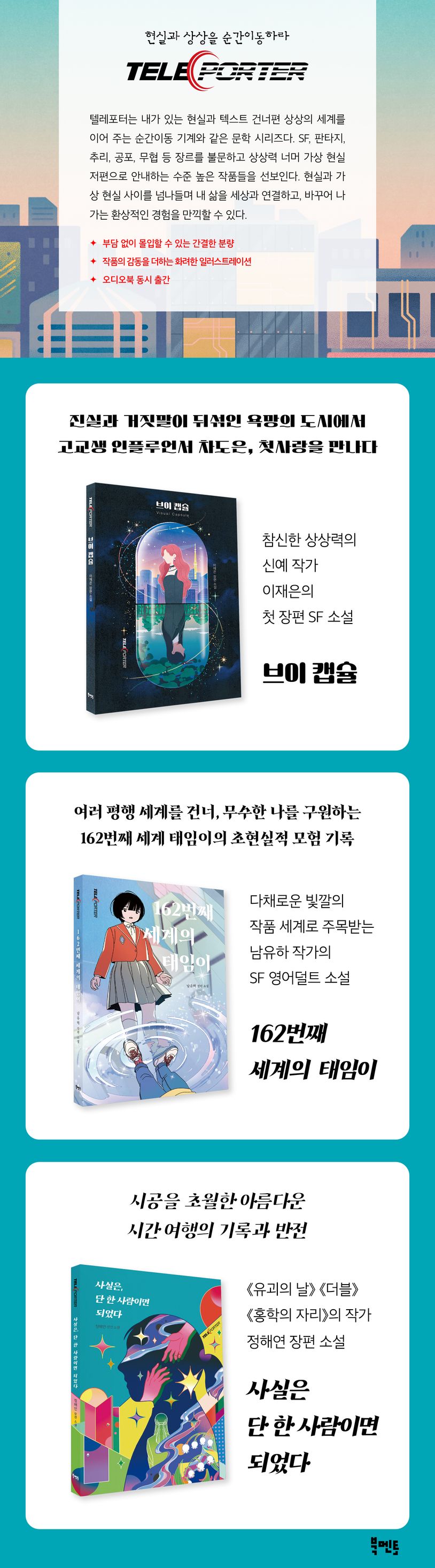 《브이 캡슐》은 SF, 판타지, 추리, 공포 등 여러 장르를 포괄하는 문학 시리즈 ‘텔레포터’의 세 번째 책이다. 최첨단 비주얼 기술이 적용된 미래 도시, 비주얼 시티. 그곳에선 누구나 원하는 외모를 구매하여 착용한다. 얼굴 생김새는 물론이고, 옷이며 신발, 머리카락, 눈동자 색까지 살 수 없는 것은 없다. 고교생인 차도은은 이런 비주얼 시티에서 가장 유명한 인플루언서다. 도은의 엄마가 바로 이 비주얼템을 개발한 회사 ‘이너피스’의 대표이기 때문이다. 어느 날, 길을 걷던 도은은 비주얼템 착용을 반대하는 시위대와 맞닥뜨리게 되고, 시위대 중 한 명이 비주얼템의 효과를 잠시 무력하게 만드는 ‘브이 캡슐’을 꺼내든다. 브이 캡슐을 본 사람들은 혼비백산하여 도망가기 시작하는데……. 과연 도은의 운명은?
