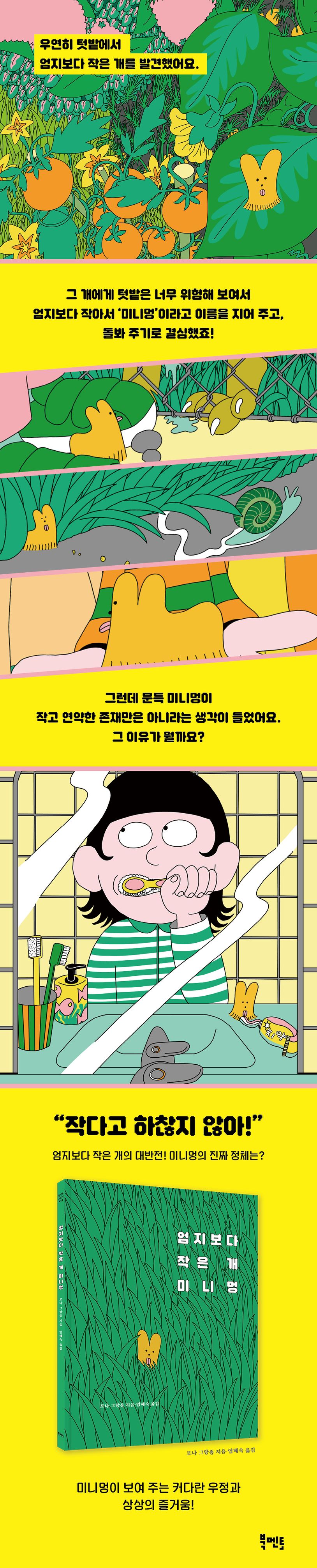 《엄지보다 작은 개 미니멍》은 돌봄과 책임감이 주는 행복을 화려한 그림과 깜짝 반전으로 유쾌하게 풀어낸 그림책이에요. 텃밭에서 우연히 엄지보다 작은 개를 발견한 아이. 아이는 그 작은 개가 좀 우스꽝스럽게 생겼지만, 그래도 그 개를 돌보기로 결심했어요. 그대로 두면 거미에게 잡아먹히거나 엄마 발에 밟힐지도 모른다고 생각했거든요. 아이는 엄지보다 작은 개에게 ‘미니멍’이라는 이름도 지어 주고, 세심히 미니멍을 돌봤지요. 그러던 어느 날 아이는 이 작고 연약할 것만 같은 미니멍이 어쩌면 자기가 생각하는 것과 달리 아주 똑똑한 존재일지도 모른다고 생각하게 되었어요. 아이는 왜 그런 생각을 하게 된 걸까요? 아이의 생각대로 미니멍은 그저 작고 연약한 작은 개가 아닌 걸까요?