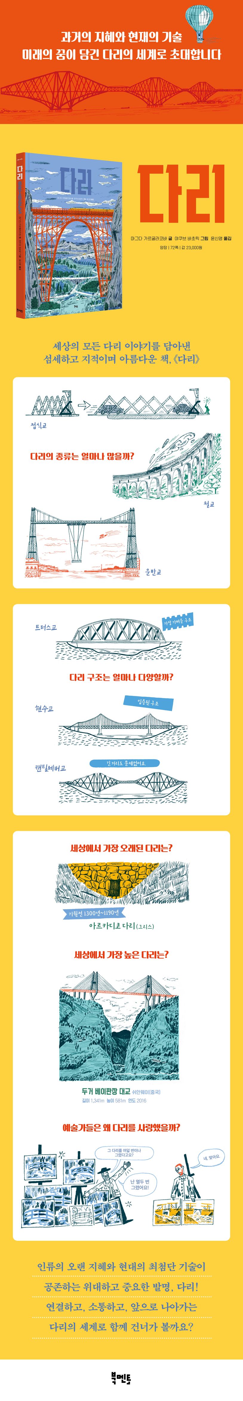 다리가 없는 세상을 상상해 보세요. 다리가 없다면 우리는 먼 길을 힘겹게 돌아서 가고, 건너편의 다른 세상과 만나는 일이 어려워지며 소통하고 교류하는 일도 불편합니다. 다리 덕분에 우리는 더 빠르고 편리하게 이동할 수 있게 되었지요. 다리는 우리 앞에 놓인 어려움을 극복하게 하고, 다른 세상과 연결해 주며, 우리가 알고 있는 세상에 대한 인식을 넓혀 한 걸음 나아가게 합니다. 《다리》는 인류의 오랜 지혜와 현대의 최첨단 기술이 응축된 위대하고 아름다운 발명품 다리 이야기를 담은 책입니다. 이 책은 다리의 구조와 종류, 만드는 방법을 비롯해 다리에 얽힌 역사와 문화 이야기까지 다리에 대한 흥미진진한 이야기를 아름다운 그림과 함께 감상할 수 있습니다. 이 책을 읽으며 연결하고, 소통하고, 나아가는 다리의 세계로 함께 건너가 볼까요?
