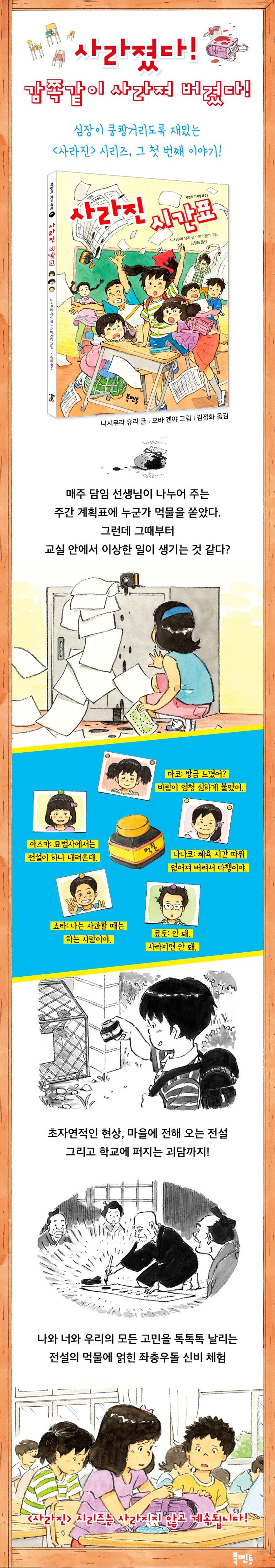 일본 초등학생 사이에서 선풍적인 인기를 끈 동화. 수상함을 넘어 불가사의한 새로운 미스터리 동화 〈사라진〉 시리즈 그 첫 번째 이야기가 출간됐다. 매주 담임 선생님이 나누어 주는 주간 계획표에 누군가 먹물을 쏟았고, 아이들은 모두 먹물로 인해 일부가 지워진 시간표를 받게 되는데…. “그럴 수도 있지.” 하고 신경 쓰지 않았던 아이들에게 하나둘씩 이상한 일이 벌어지고 만다. 시간표에서 지워진 시간들이 전부 실제로도 사라져 버리기 시작한 것이다. 이건 전부 묘법사라는 곳에서 전해지는 먹물의 전설과 관련이 있다는데… 과연 아이들의 운명은 어떻게 될까?