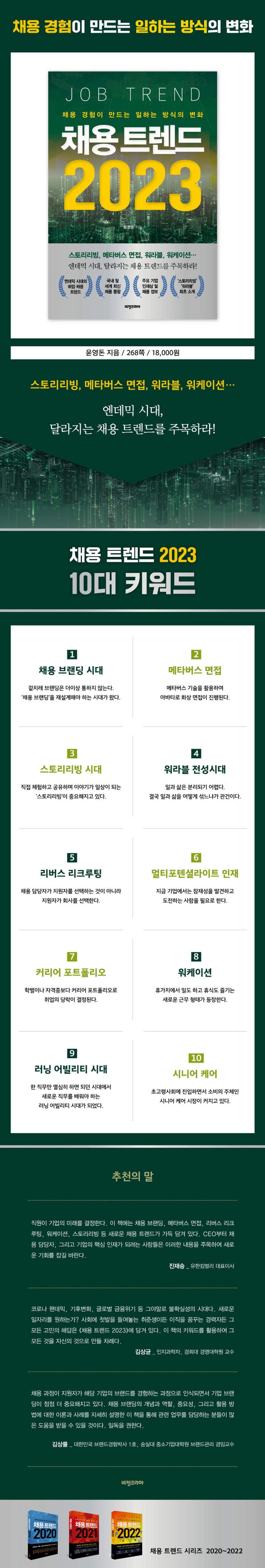 커리어코치이자 채용 전문가인 윤영돈 저자는 지난 2020년부터 국내외 최신 채용 트렌드를 돌아보면서 새로운 키워드를 독자들에게 소개하고 있다. 이번 《채용 트렌드 2023》에서는 엔데믹 시대에 주목할만한 채용 트렌드를 10가지 키워드로 정리하여 국내외 채용 동향과 함께 소개한다. 이 책에서 소개하는 키워드를 지침으로 삼아 나만의 ‘채용 스토리’를 만들 수 있다면 스토리리빙의 시대에 확실한 채용 기회를 잡을 수 있을 것이다.