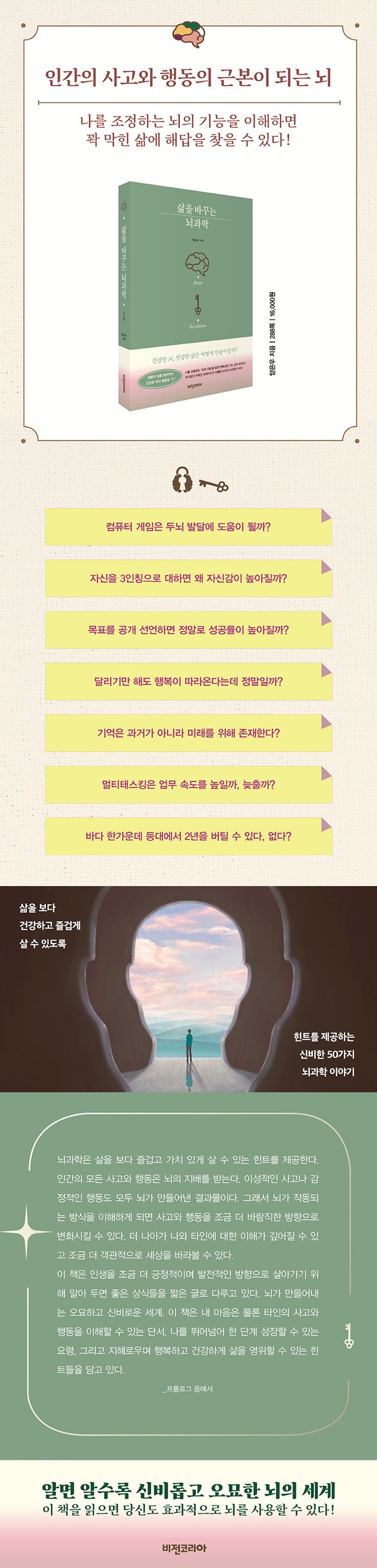 누구나행복해지고싶다.꿈을가지고열심히노력하는것도,타인과좋은관계를맺기위해작은용기를내는것도,성과를내기위해열정을다해일하고,스트레스를해소하기위해여행을떠나거나취미활동을하는것도모두행복해지기위해서다.하지만열심히노력해도꿈은점점더멀어지는것만같고,아등바등일해도업무효율은떨어지며,타인과좋은관계를맺고싶지만상처를받고,스트레스를풀기위해즐기는취미생활이오히려힘겨울때도있다.도대체왜그럴까?우리몸의컨트롤타워이자가장복잡하고신비로운뇌를이해한다면이모든문제의실마리를찾을수있다.
