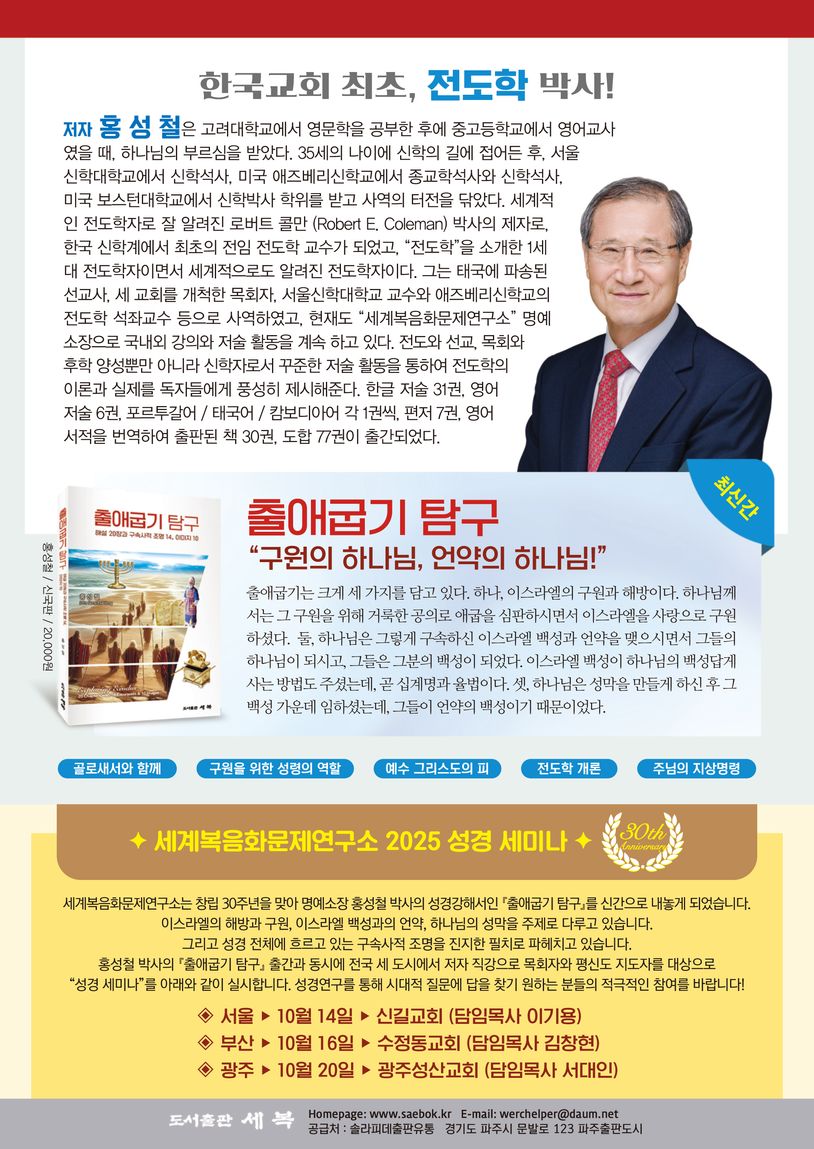 셋, 하나님은 성막을 만들게 하신 후 그 백성 가운데 임하셨는데, 그들이 언약의 백성이기 때문이었다. 그런 세 가지 드라마를 보기 위해 본문 해설을 20장으로 압축했고, 출애굽기가 다른 성경과 연결된 내용을 보기 위해 ‘구속사적 조명’ 14를 더했다. 독자는 이 『출애굽기 탐구』를 통해 장엄한 구속사의 드라마를 볼 것이며, 하나님께서 언약을 맺으신 이스라엘 백성에게 임하신 목적을 깨닫고, 모든 그리스도인을 구원하신 목적도 깨닫게 하는 책이다.