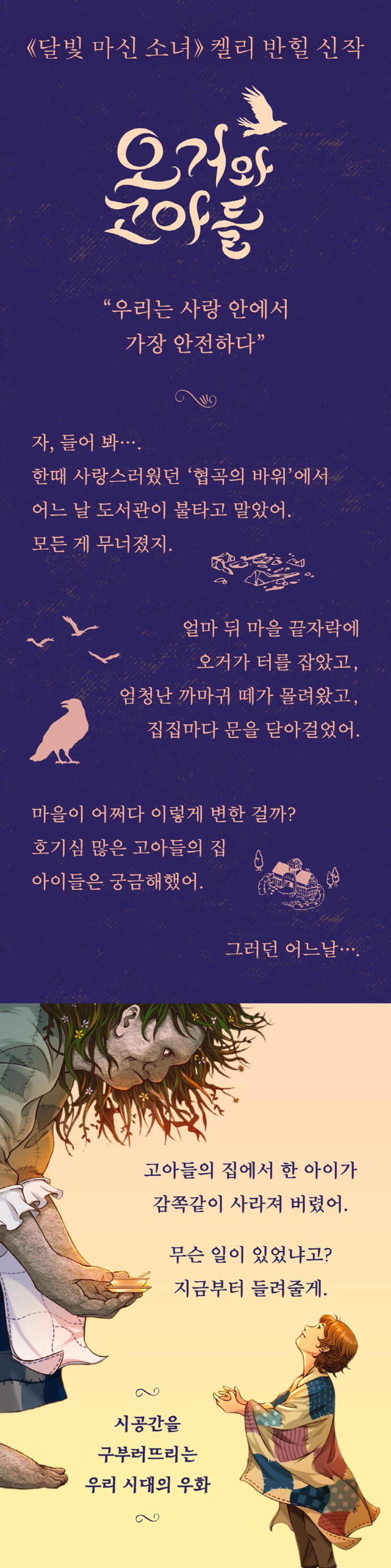 “이 소설 자체가 순수한 마법”이라는 평을 받으며 2017년 뉴베리 수상작에 선정되었던 《달빛 마신 소녀》의 작가 켈리 반힐이 또 한 번의 마법 같은 소설로 찾아왔다. 슬픔을 이겨 내는 마음에 관해 아름답고 환상적인 이야기로 풀어냈던 저자는, 이번 책에서 더욱 풍부하고 역동적인 등장인물들과 함께 유머러스하면서도 아름다운 산문으로 우리가 마음의 길을 잃지 않도록 손잡아 준다. 저자가 안팎으로 힘든 시기를 보내는 동안, 끈질기게 마음에 남는 질문을 따라가며 탄생한 《오거와 고아들》은 올해 3월 해외에서 출간되자마자 고전 판타지로 주목받고 있다.
