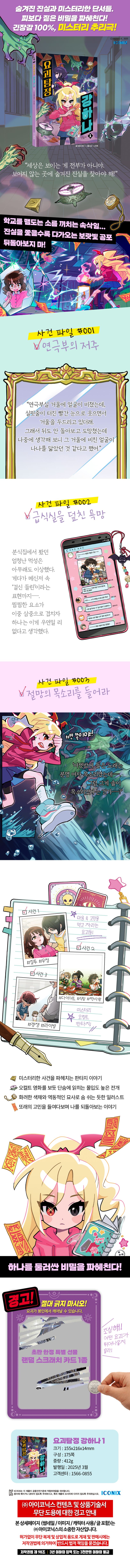 프롤로그사건파일#001연극부의저주악몽의문의실종미스터리전학생수상한연극부실202사건파일#002급식실을덮친욕망요괴와인간사이분식집의불청객편의점에남겨진악취괴상한피구부급식실에서의대결사건파일#003절망의목소리를들어라THEMOON바다에서생긴일불길한냄새파도가부르는노래침묵의목소리