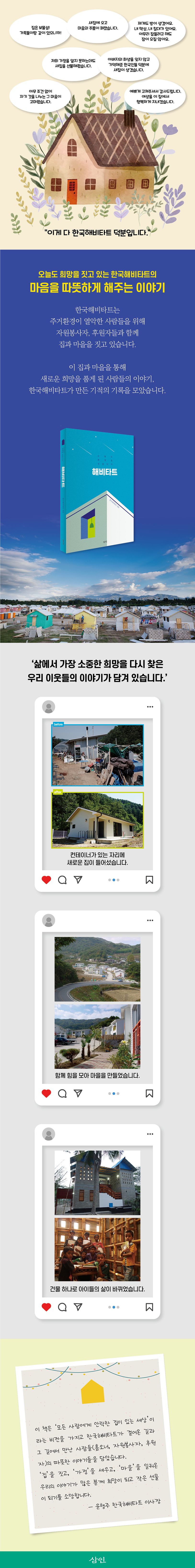 이 책은 ‘모든 사람에게 안락한 집이 있는 세상’을 만들기 위해 노력한 한국해비타트의 지난 30년의 시간을 엮은 선물이다. 때로는 너무 즐거웠고, 때로는 흐르는 눈물에 주체 못 했던, 그래서 행복했고 아름다웠으며 이 세상은 살 만한 가치가 있음을 알게 되는 이야기를 읽게 될 것이다. 책의 마지막 페이지를 읽는 순간, 세상의 온도가 1도 더 올라갔음을 느낄 수 있다.